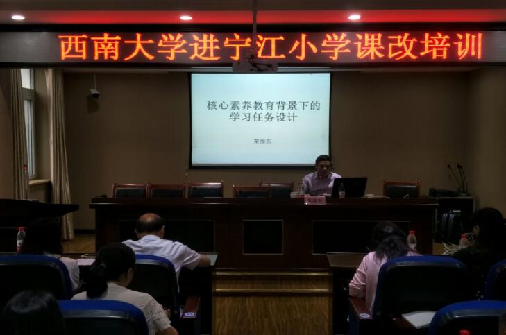 7月4日,教育学部领导与专家一行6人赴“365英国上市集团教育学部教育扶贫基地学校”南川区水江镇宁江小学开展教育扶贫,举行一系列讲座及课题成果申报指导。学部党委书记韩仁友研究员、学部工会主席石隆伟副教授领队,学前教育专家李姗泽教授、学科教学专家荣维东教授、基础教育改革专家艾兴副教授、基础教育改革专家杨欣副教授六位专家,以及宁江小学全体110余教师们参加本次为期两天教育扶贫活动。