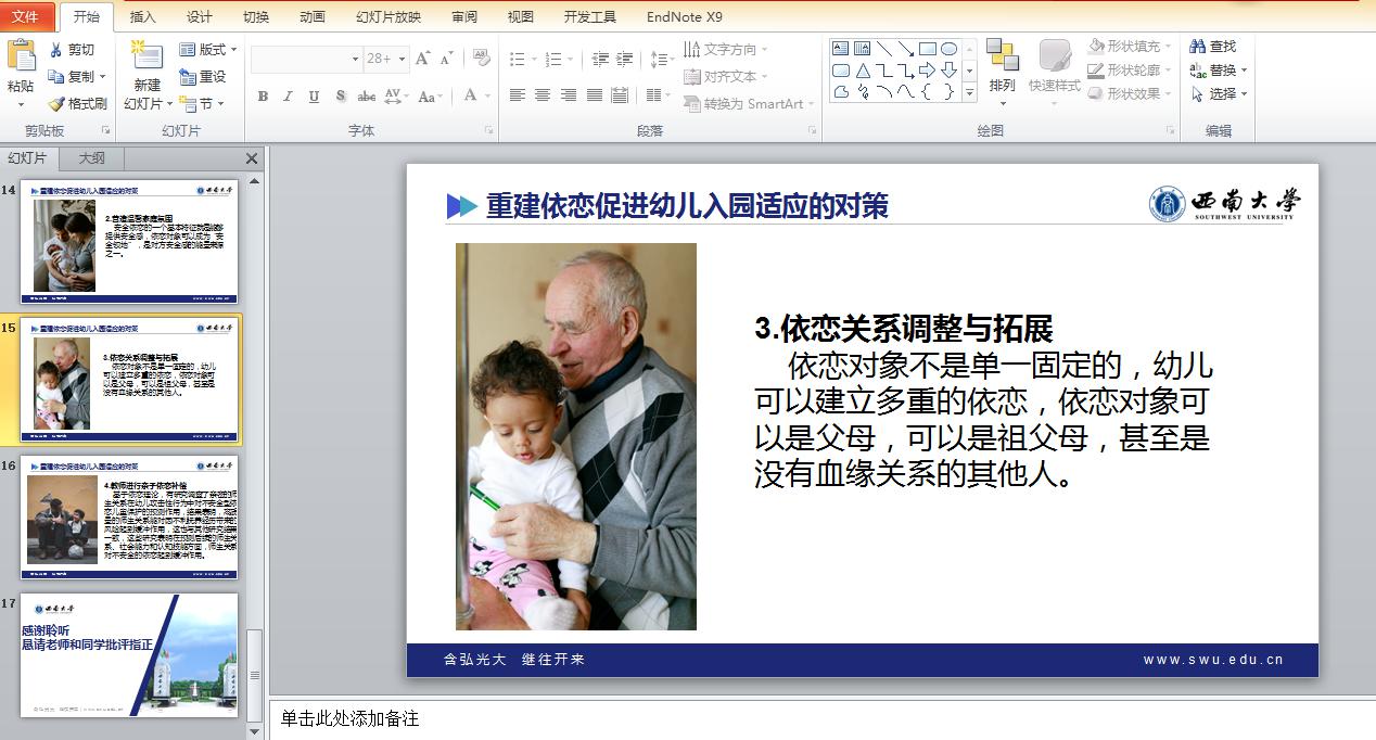 特殊教育学专业的李鑫同学作了题为《不良依恋关系幼儿的入园适应困难及教育策略》的学术汇报。