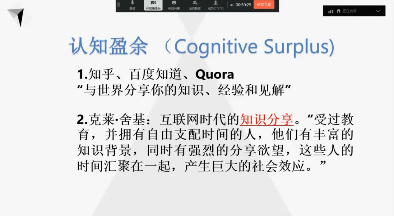 接着,教育经济与管理专业的牛睿同学作了题为《认知盈余推动教师学习变革:理路与策略》的报告。首先,牛睿同学对认知盈余理论进行概念界定;接着,牛睿同学指出,认知盈余通过改变知识的生产和配置以及学习的内容与方式,带来了学习革命,同时也通过加强教师学习的自主性以及推动教师专业知识转化与再创造等途径,实现了教师的学习变革;最后,牛睿同学指出,认知盈余能够通过技术手段实现优质知识和教学智慧共享以促进教师的有效学习,但也可能导致教师学习的系统性不够、持续力不足、针对性不强等问题。因此,需要提升教师对认知盈余的识知、激励教师认知盈余的共享与分享、搭建技术平台提升教师参与者的体验,以促进认知盈余在教师学习中的应用。