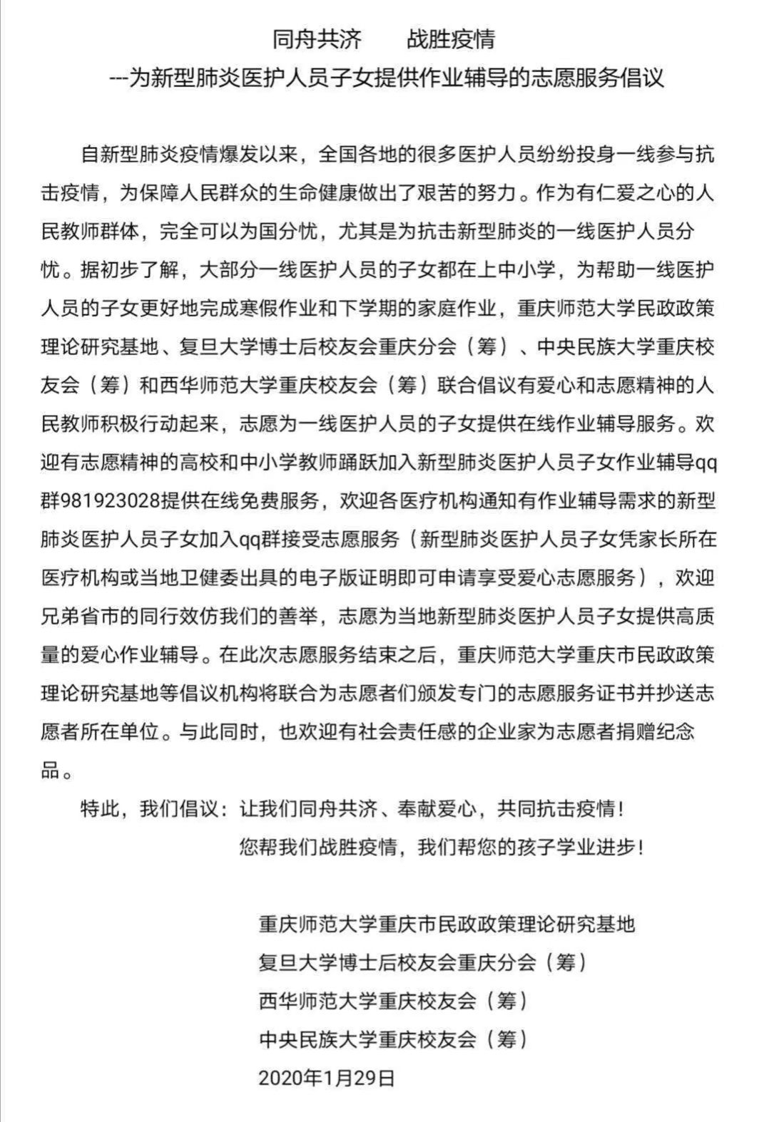 刚好在2019年1月30日,得知重庆师范大学的肖陆军教授在组建志愿者团队为奋战在一线的医务工作人员以及患者的子女提供在线作业辅导服务,我怀着无比兴奋与激动的心情联系了肖教授,表达了我想加入这个志愿团的想法,为此本疫情献出自己的一份力量。那时候咱们这个志愿团队刚建立不久,在肖教授的安排下,我担任了本次志愿者活动的组织管理工作人员,负责向本次疫情指定医院宣传我们的志愿活动、QQ群的日常管理、志愿者教师和服务对象的对接及其其它日常工作。