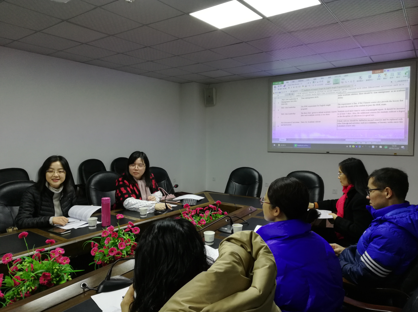 随后,本次会议围绕全英文留学生培养方案中对留学生中文语言水平等级要求的细则说明、全英文课程设置与部分课程调整、学分和课时的具体分配、核心课程的标准化要求、硕士博士论文开题与答辩的时间安排等细节性问题进行最后的商讨与确定。
