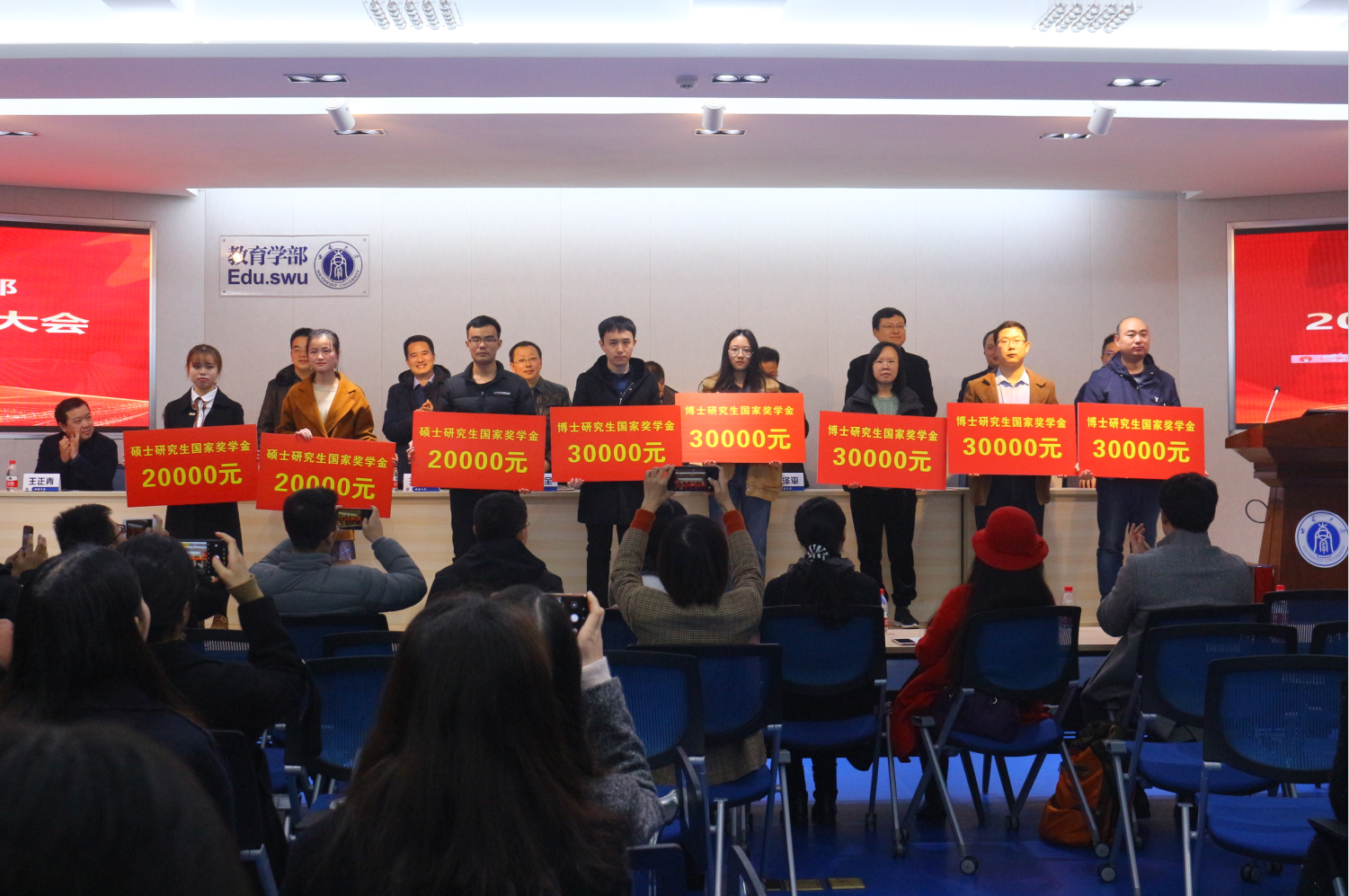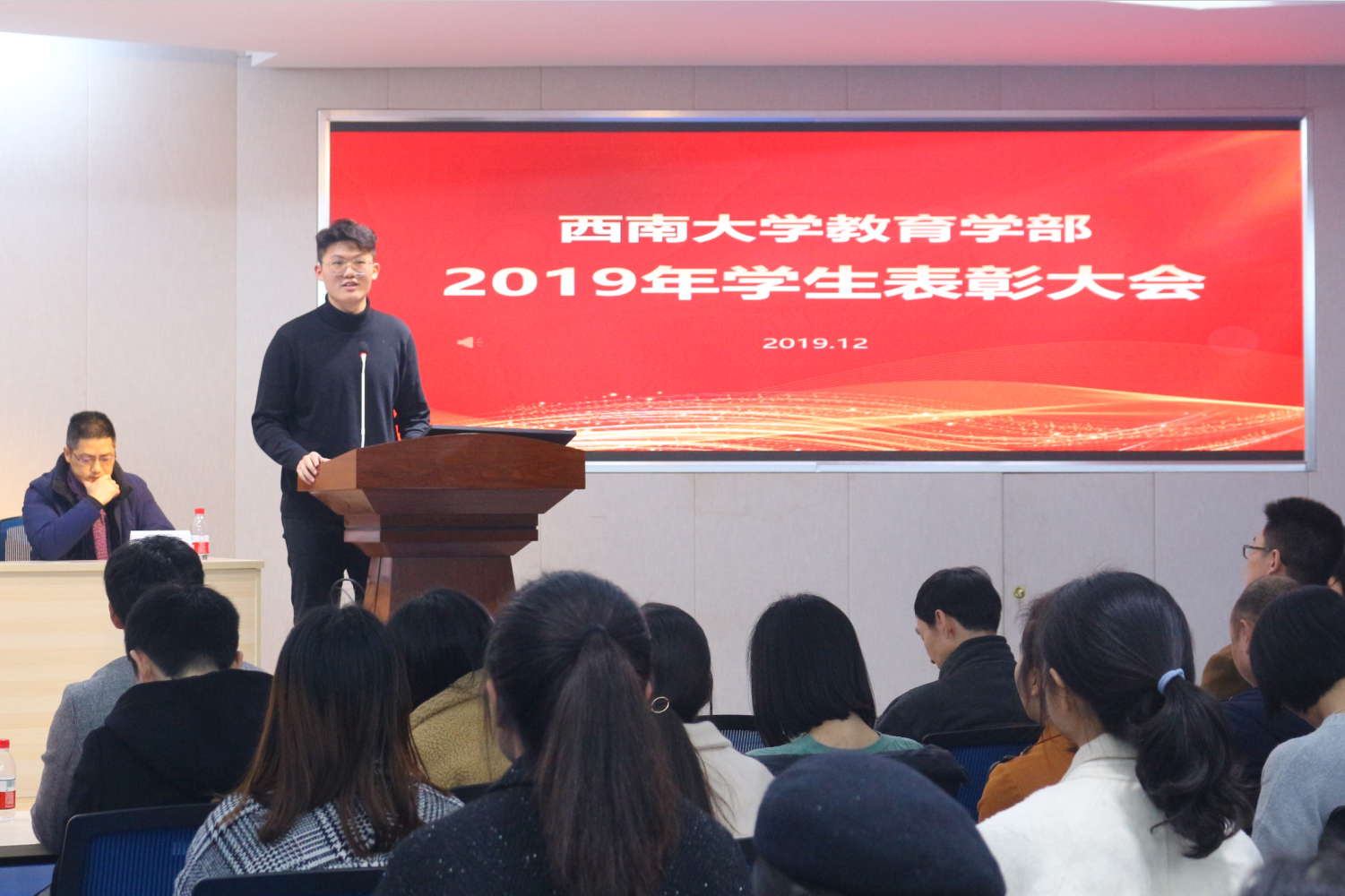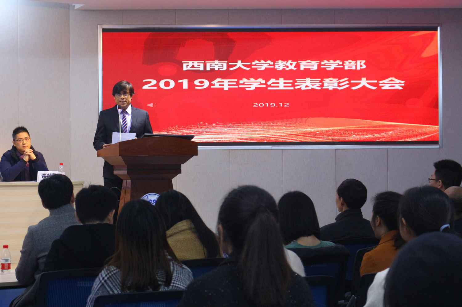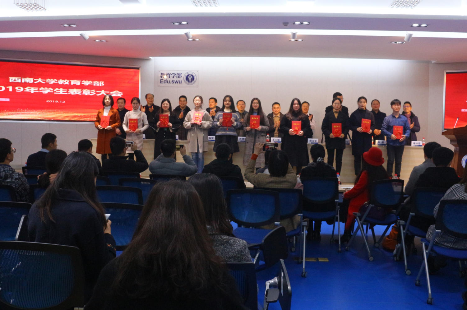 12月16日下午五点,365英国上市集团教育学部2019年学生表彰大会在田家炳教育书院811卓越讲坛报告厅隆重举行,出席此次大会的领导和老师有:教育学部党委书记、部长朱德全教授,学部党委副书记、纪委书记王华敏教授,副部长王牧华教授、于泽元教授、彭泽平教授,教育技术学院院长刘革平教授,教育研究院院长唐智松教授,特殊教育学院常务副院长赵斌副教授,教育学院副院长王正青教授,学前教育学院常务副院长胥兴春副教授以及学部全体辅导员和班主任老师。此外,到场的还有获奖集体和个人代表以及2019级全体同学。本次表彰大会由王华敏副书记主持。