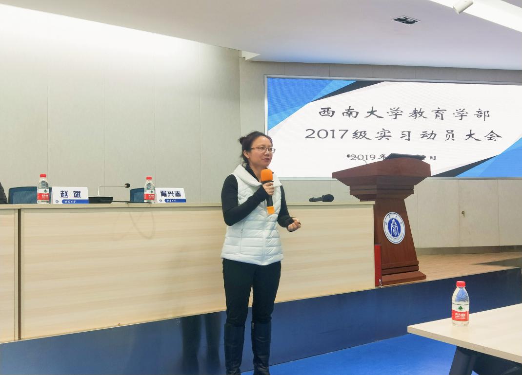 2019年12月31日下午三点,365英国上市集团教育学部2017级实习动员大会在田家炳教育书院811卓越讲坛报告厅隆重举行,出席此次大会的领导和老师有:教育学部党委副书记、纪委书记王华敏教授,教育学部副部长彭泽平教授,教育学院院长幺加利教授,教育学院副院长王正青教授,特殊教育学院常务副院长赵斌副教授,学前教育学院常务副院长胥兴春副教授,实习指导教师邓翠菊副教授、苏贵民副教授、胡福贞副教授、王丹副教授、余璐副教授、王伟老师,凌东山老师、杜林老师和张铭凯老师,本科2017级晏阳初创新实验班班主任郑鑫副教授,本科教学秘书胡熔老师,本科2016级、2017级辅导员张放老师,本科2019级辅导员杨岗老师。此外参加此次动员大会的还有2017级全体学生。本次动员大会由王华敏副书记主持。