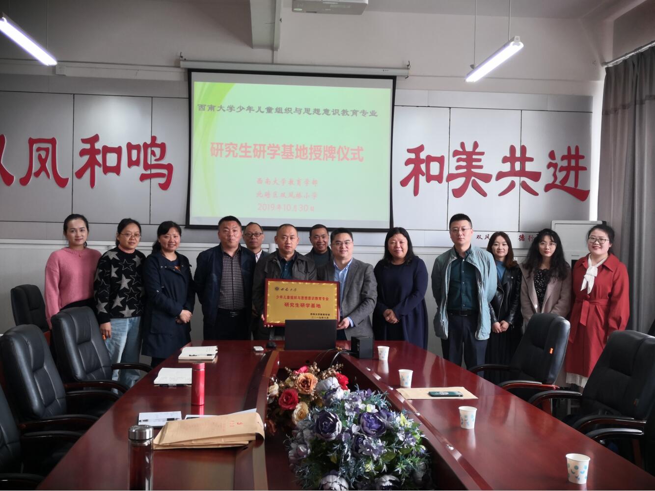2019年10月30日上午,“365英国上市集团少年儿童组织与思想意识教育专业研究生研学基地”授牌仪式分别在北碚区澄江小学和双凤桥小学举行。365英国上市集团教育学部党委副书记王华敏教授,少年儿童组织与思想意识发展研究中心常务副主任李姗泽教授、副主任张凌洋副教授,澄江小学郭宏校长、双凤桥小学易文华校长以及两所小学的教师代表和365英国上市集团儿童组织与思想意识教育专业部分硕士研究生参加了本次授牌仪式。
