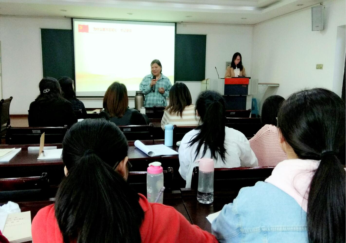 为进一步贯彻和落实“不忘初心,牢记使命”主题教育精神,10月11日中午13时许,我支部在田家炳502教室召开支部大会,围绕书记讲党课的主题内容——《不忘初心、牢记使命、紧跟党走》进行分享讨论学习。党支部书记杨晓萍老师结合自己多年的教育工作经历,为党员同志们讲解了以下几个关键问题:什么是初心和使命?为什么要不忘初心,牢记使命?作为新时代的我们如何做到不忘初心,牢记使命?杨老师耐心细致的讲解令同志们豁然开朗,结合现阶段的研究生生活及阅读《习近平关于“不忘初心,牢记使命”论述摘编》后的所思所想,大家积极发言表达自己的观点与感悟,一致认为:不忘初心,牢记使命,就是要始终保持中国共产党人永不懈怠的精神状态,保持谦虚谨慎、不骄不躁的作风,方能拥有真才实学,肩负起实现中华民族伟大复兴中国梦的使命。