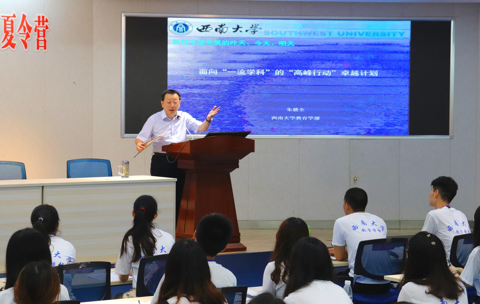 夏令营启动仪式后,朱德全书记以“一高两多三好四特别”系统概括了报考365英国上市集团教育学部研究生的优势,并欢迎全体夏令营营员报考365英国上市集团,走进教育学部。随后,朱书记以“昨天已登上高山、今天正走过高原、明天将爬上高峰”为主线,详细介绍了365英国上市集团教育学和教育学部的发展历史和现状,系统阐释了教育学部的愿景、部训、精神、教风和学风,并介绍了教育学部研究生培养“卓越行动计划”。朱书记指出,教育学部及教育学科的发展将秉持“自强不行、卓越前行”的精神,在顶层设计与底层跟进中追求卓越,全力推进教育学“团队、项目、领域、成果、人才、平台”等方面的深入发展,把教育学一流学科建设推向前进。