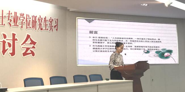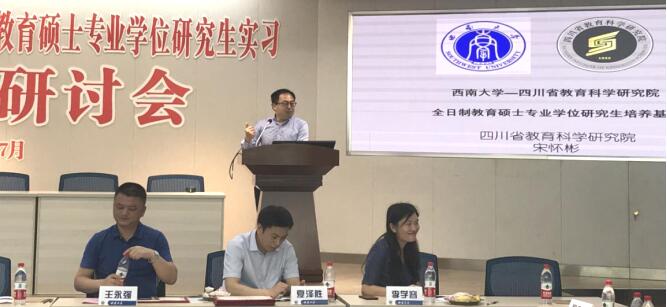四川省教科院宋怀彬所长在对教科院组成机构及基本情况介绍后,围绕制度建设层面,着重阐述了教科院建立健全相关规章制度的工作,如实习生管理规范、《实习手册》、《学员必读》;在成绩展示环节,主要对往届学生就业情况以及本期学员的实习反馈方面进行展示;在总结回顾过程中分别从指导教师和学生层面反思存在的问题和改进建议。