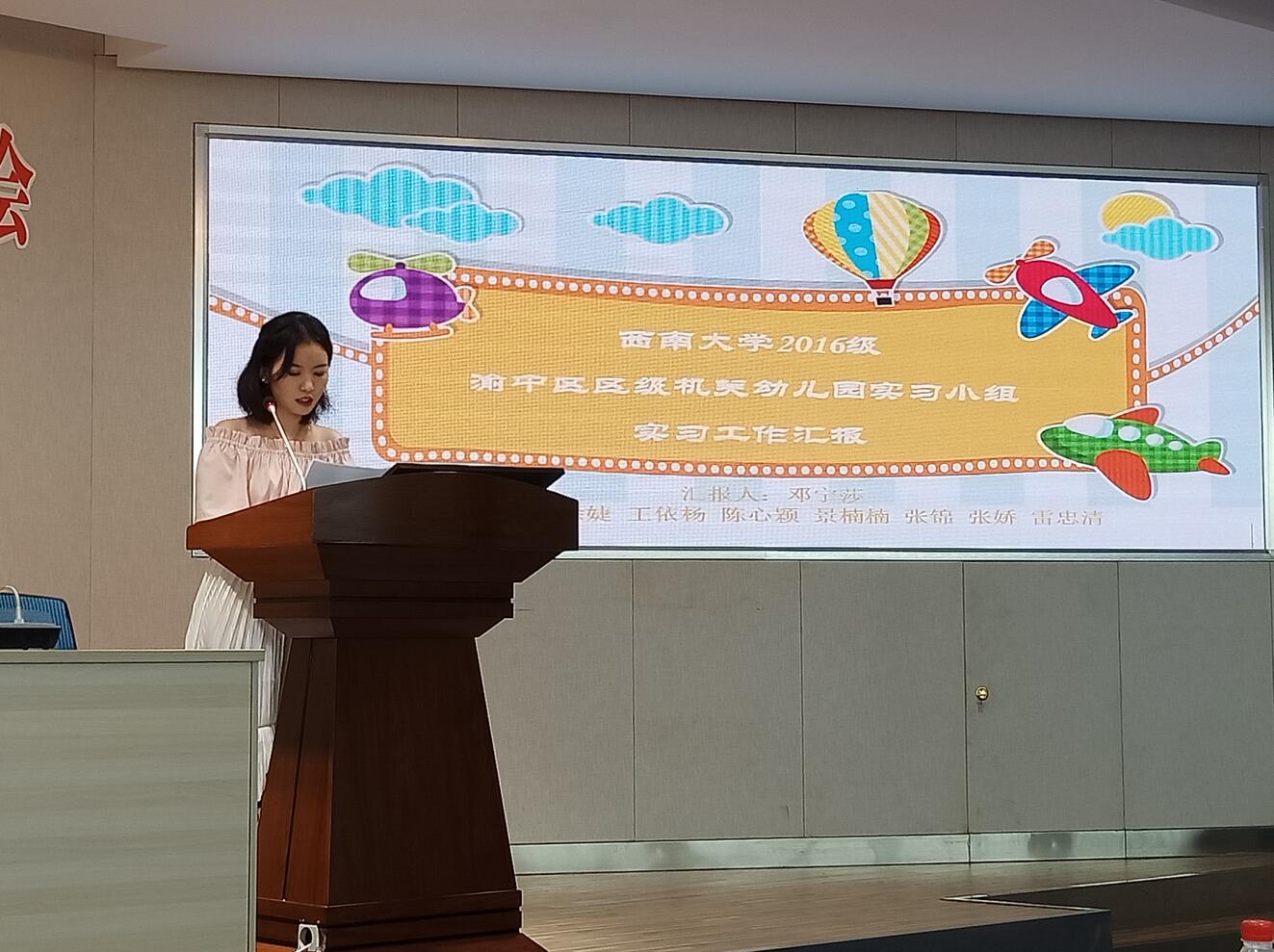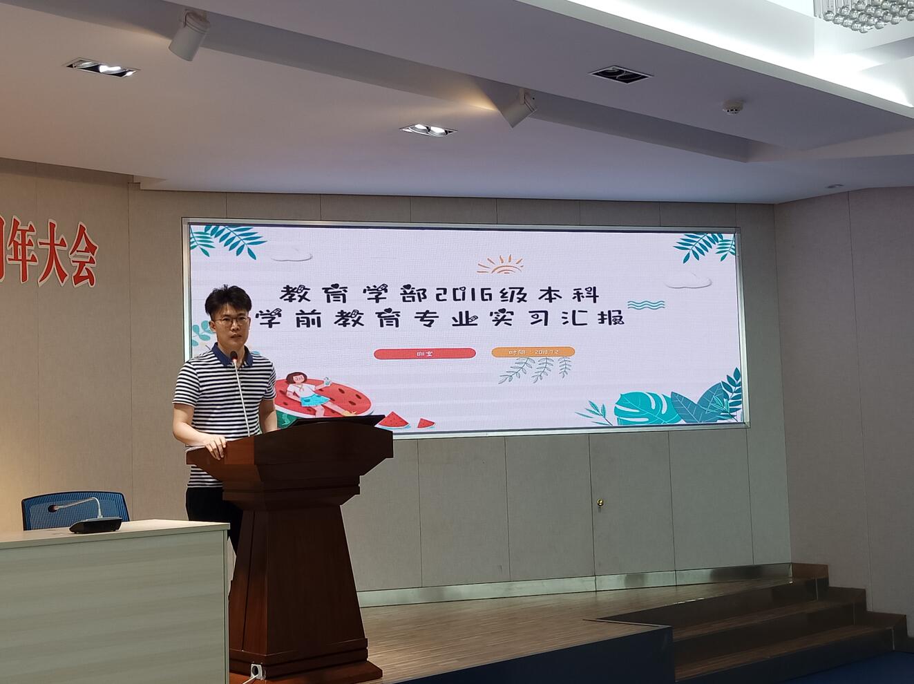 伴着三月的玉兰香,我们踏上了实习的征程。一学期以来,我们在孩子们的欢声笑语中,在老师们指尖划过的休息音乐中轻喃初心的音符。时间缓缓溜走,为期四个月的教育实习生活也画上了圆满的句号。7月2日下午3点,教育学部本科2016级学前教育专业实习总结汇报会在学部811卓越讲坛报告厅举行。学前教育学院副院长胥兴春副教授,实习指导教师王丹副教授、苏贵民副教授、王伟老师和余璐老师,以及2016级学前教育专业全体实习同学参加了本次汇报会。