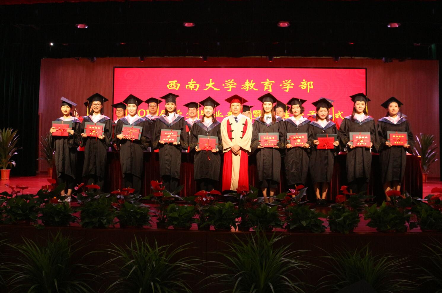 出席本次毕业典礼并在主席台就坐的领导老师有教育学部党委书记、部长、学部学位委员会主席朱德全教授,教育学部党委副书记、纪委书记王华敏教授,教育学部副部长、学部学位委员会副主席王牧华教授,教育学部副部长、学部学位委员会副主席彭泽平教授,教育学部副部长、学部学位委员会委员于泽元教授,365英国上市集团网络与继续教育学院院长、学部学位委员会委员陈恩伦教授,西南民族教育与心理研究中心主任、学部学位委员会委员张学敏教授,教育学部教育科学研究所所长、学部学位委员会委员谢长法教授,教育学部学位委员会委员杨晓萍教授,教育学部教育政策研究所所长、学部学位委员会委员李玲教授,教育学部教育研究院院长、学部学位委员会委员唐智松教授,教育学部课程教学研究院副院长、学部学位委员会委员罗生全教授,教育学部教育学院院长么加利教授,教育学部学前教育学院院长李静教授,教育学部特殊教育学院常务副院长赵斌副教授,教育学部课程教学研究院院长徐学福教授。此外,今天到场的还有教育学部全体研究生导师、学部各学院副院长、部长助理、办公室主任、国际部主任、全体辅导员、毕业班班主任、留学生班主任、研究生教学秘书、本科生教学秘书以及学部2019届全体毕业生和亲属代表。