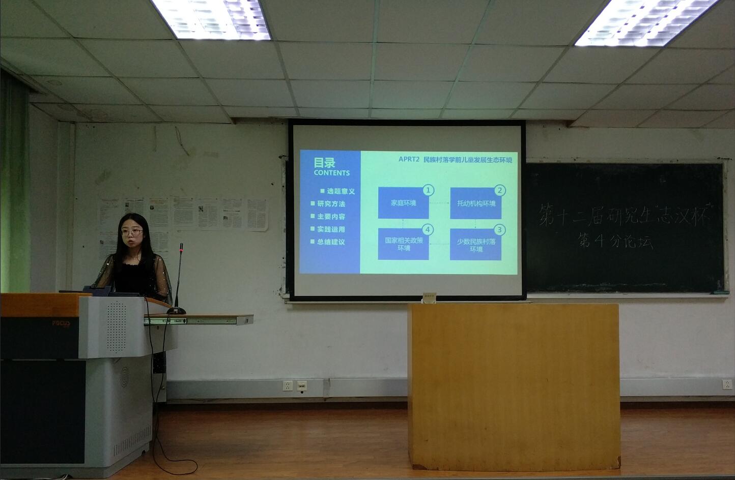 活动伊始,主持人牛睿同学向大家介绍了担任本次比赛的评委老师和参赛选手的基本情况,并对本次竞赛的流程和规则进行了说明。选手们按顺序依次上台对论文成果进行汇报展示。14名选手选题涉及广泛,研究方法多样,主要从问题提出、研究设计、研究方法、研究结论、对策建议等方面对论文进行分享。其中,蒲阳同学采用叙事研究法对广西壮族村落学前儿童生存现状进行了调查,并从多方面提出了对策建议。何姗同学运用问卷调查法探讨了大学生职业使命感对其学业满意度之间的关系以及学业自我效能感在其中的作用。文欣月同学以比较的方式,对人工智能时代个性化学习新路径进行了分享。