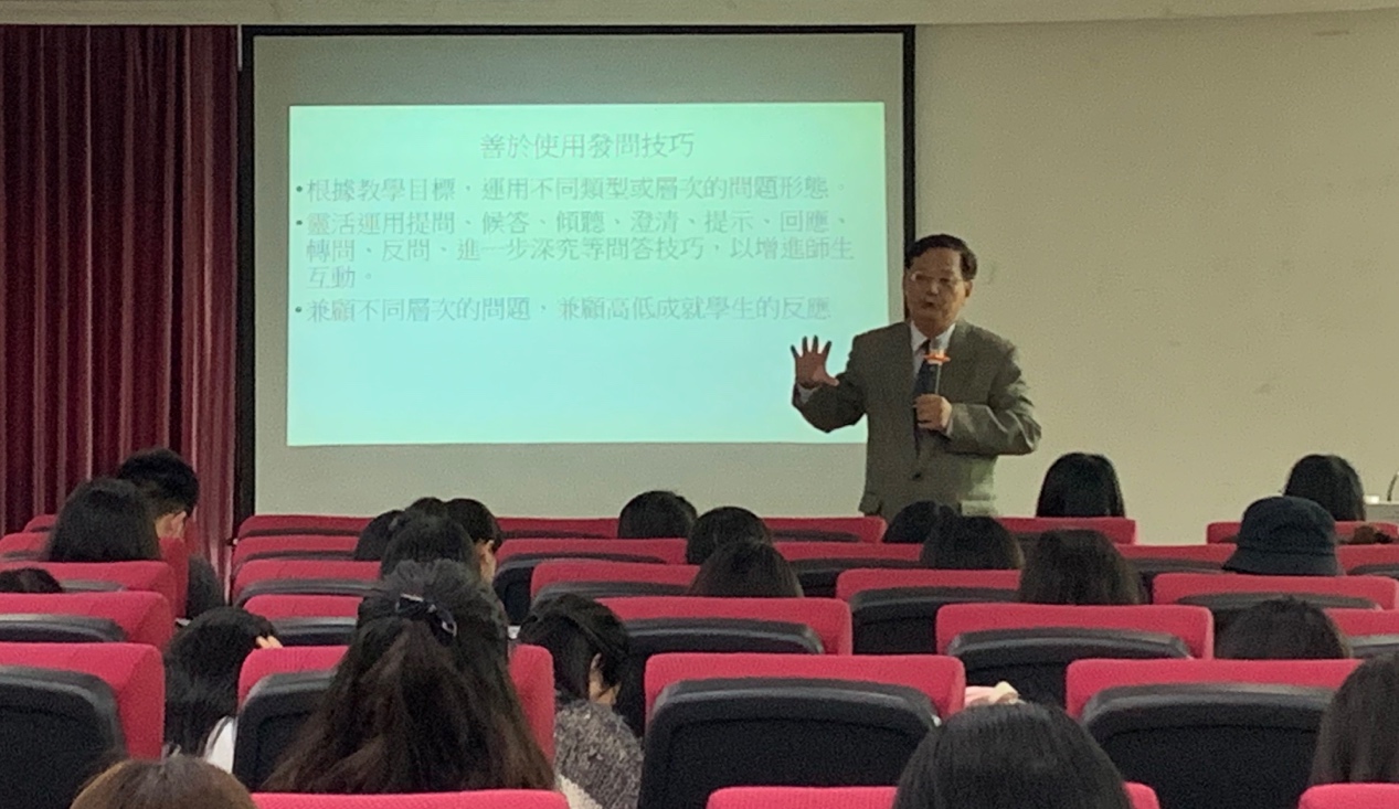 蔡教授此次讲座由两个主题组成,首先是《HRASE逐步质问法在语文教学上的运用》。蔡教授用生动形象的比喻展现了同一个老师教学下,学生接受程度的巨大差异,引出了在座的学生对于传统直接讲授和引导式教学的比较与思考,接着导入了封闭式问题和开放式问题、聚敛性问题和扩散性问题的概念。用美国老师与学生就灰姑娘的故事进行讨论的这一课堂案例对于HRASE逐步质问法进行了阐述,即历史(history过往经验)、关系(relationship连接经验)、应用(application应用知识)、推测(speculation深度思考与推测)、解释(explanation解释运用结果)。蔡教授在介绍该教学方法时,利用一系列实验和课堂案例进行详细的解释,辅之以相关的理论基础,引发了在场学生们的积极讨论。