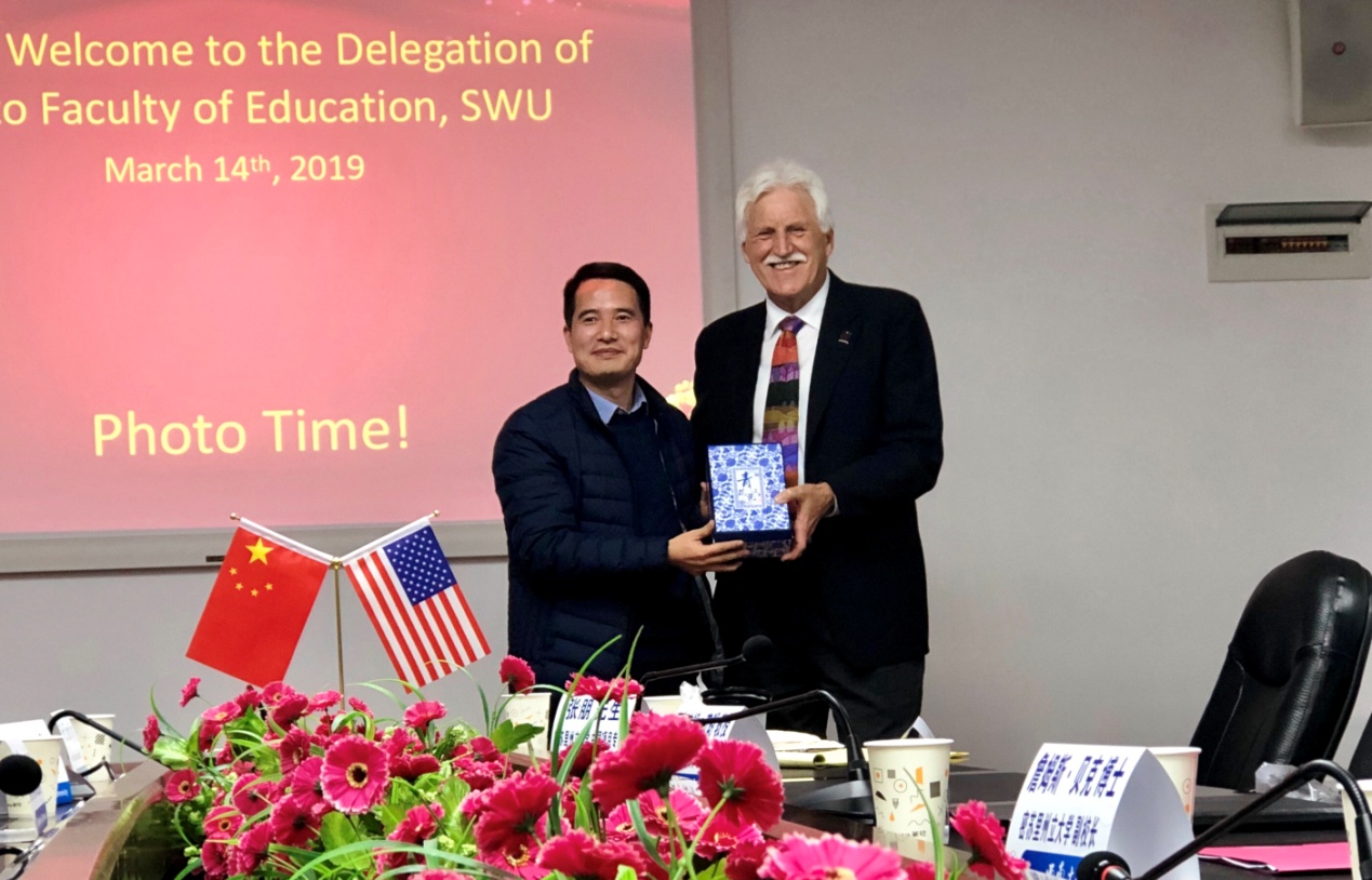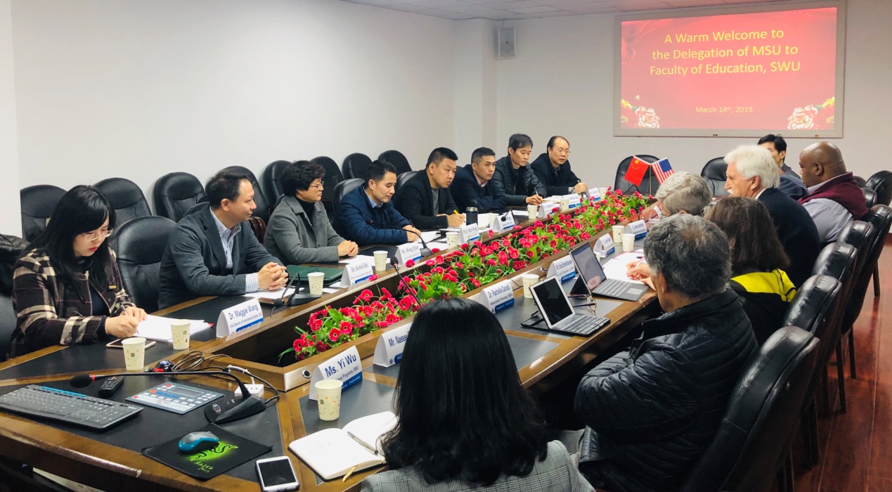 3月14日下午,在校国际处交流科王骏科长的陪同下,美国密苏里州立大学(Missouri State University)副校长詹姆斯·贝克博士(Dr. James Baker)一行八人来访学部。教育学部王牧华副部长、部长助理谯宏老师、罗生全教授、唐智松教授、国际部戴华鹏主任等出席本次座谈。双方就两校联合培养教育博士的合作事宜展开初步讨论。座谈由戴主任主持。