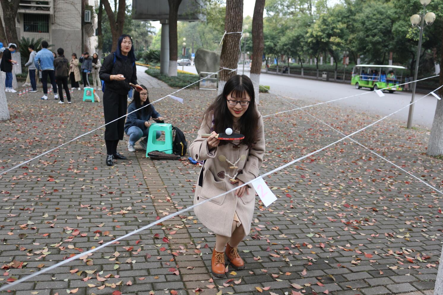 主持人宣布活动正式开始后,同学们便奔向不同的游戏区开始游戏。在游戏“仙贝争夺战”中,参与者须蒙眼转五圈之后,在同伴的指引下通过指定的路线到达终点吃仙贝。蒙眼参与游戏对同学们的身体协调性和同伴间的配合都有很高的要求,但大家经过不断的努力都顺利通过了这一关卡。紧接着是“乒乓转圈圈”的游戏,参加这个游戏的同学要一边拿着乒乓球拍,在保证球拍上的乒乓球不掉落的情况下,一边按顺序通过用绳子围起来的障碍,顺利通过所有障碍并且乒乓球没有掉落即为胜利。为了能将球顺利运到指定地点,同学们都使出了浑身解数,参加游戏的人在努力,在一旁观战的同学也在暗暗加油呐喊。