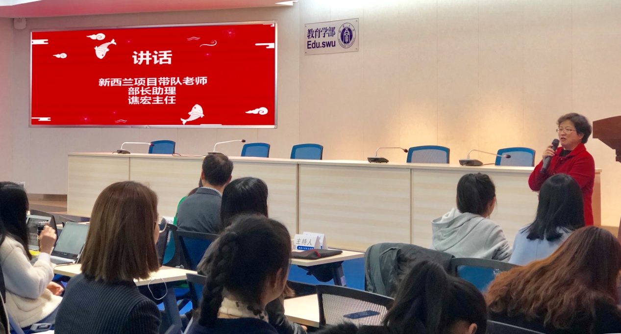 接下来,由各项目的带队老师发言。谯主任作为新西兰怀卡托大学(UW)海外实习项目带队老师,对该项目的开展情况进行了分享,介绍了参加该项目的22位同学在新西兰小学的实习经历与出色表现。谯主任还就自己在新西兰的所见所闻、所学所想及从中的感悟做了全面的分享。