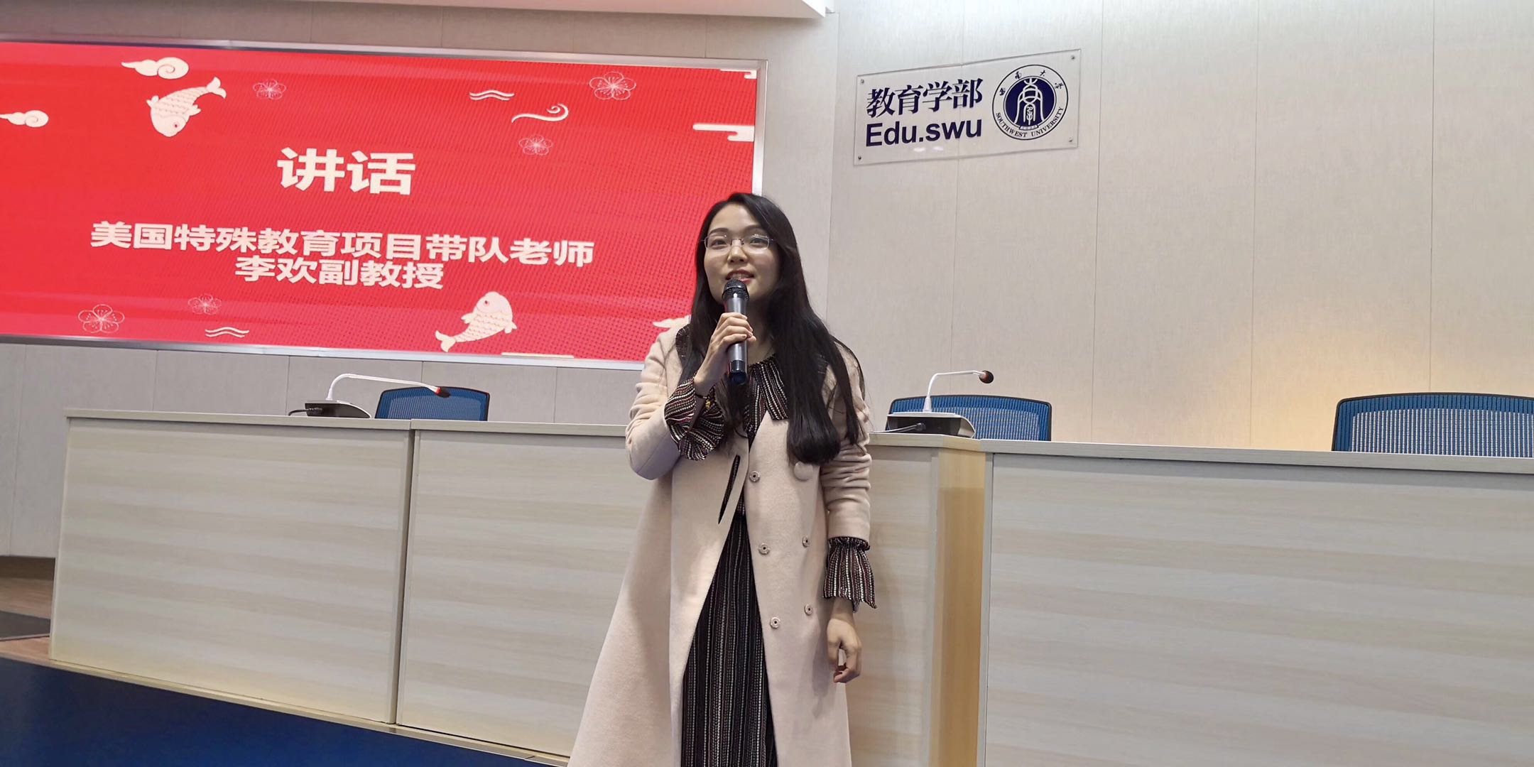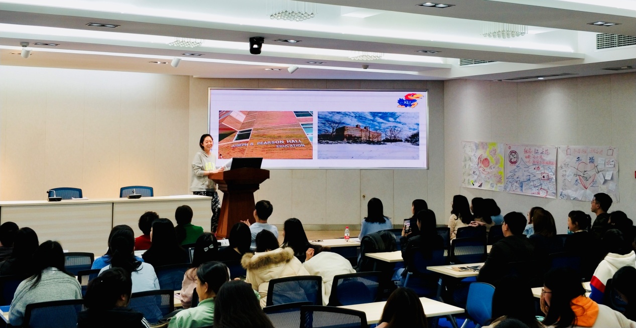 美国特殊教育项目带队老师李欢副教授声情并茂的分享了堪萨斯大学(KU)的项目的精彩点滴,她感言此行实现了自己多年来的梦想,收获颇丰。KU作为美国乃至全球顶尖的特殊教育专业一流大学,一直是特教人梦寐以求的学习圣地。李老师对于学部为促成项目近三年来的努力给予了肯定与感激,呼吁特教的同学们一定要把握机会,积极参加。另一位带队老师秦荣芳主任也分享了自己的收获与感言。