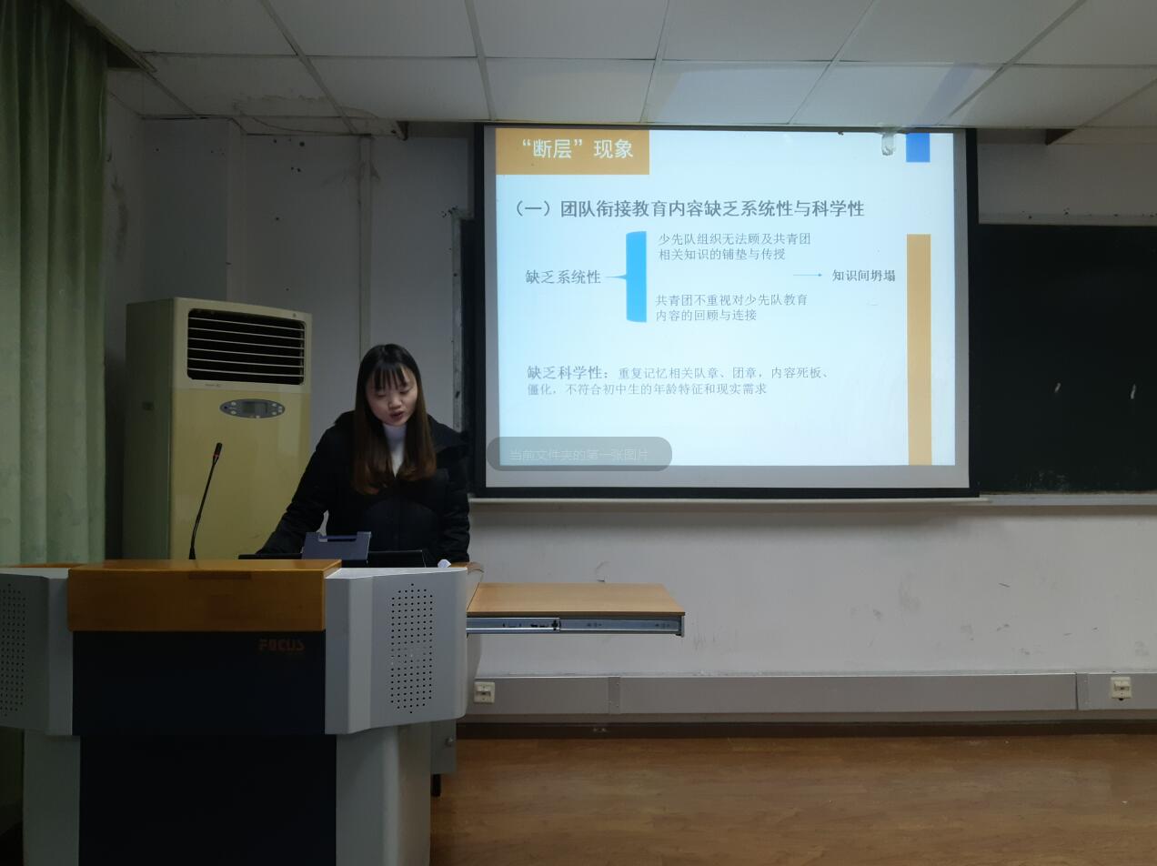 再次,少年儿童组织与思想意识专业的田梦同学以《初中团队衔接的“断层”与“接口”》为题进行汇报,她从人类发展生态学的角度出发,以布朗芬布伦纳的生态系统理论为基础,对初中团队衔接中出现的问题进行原因分析并提出相应的对策。