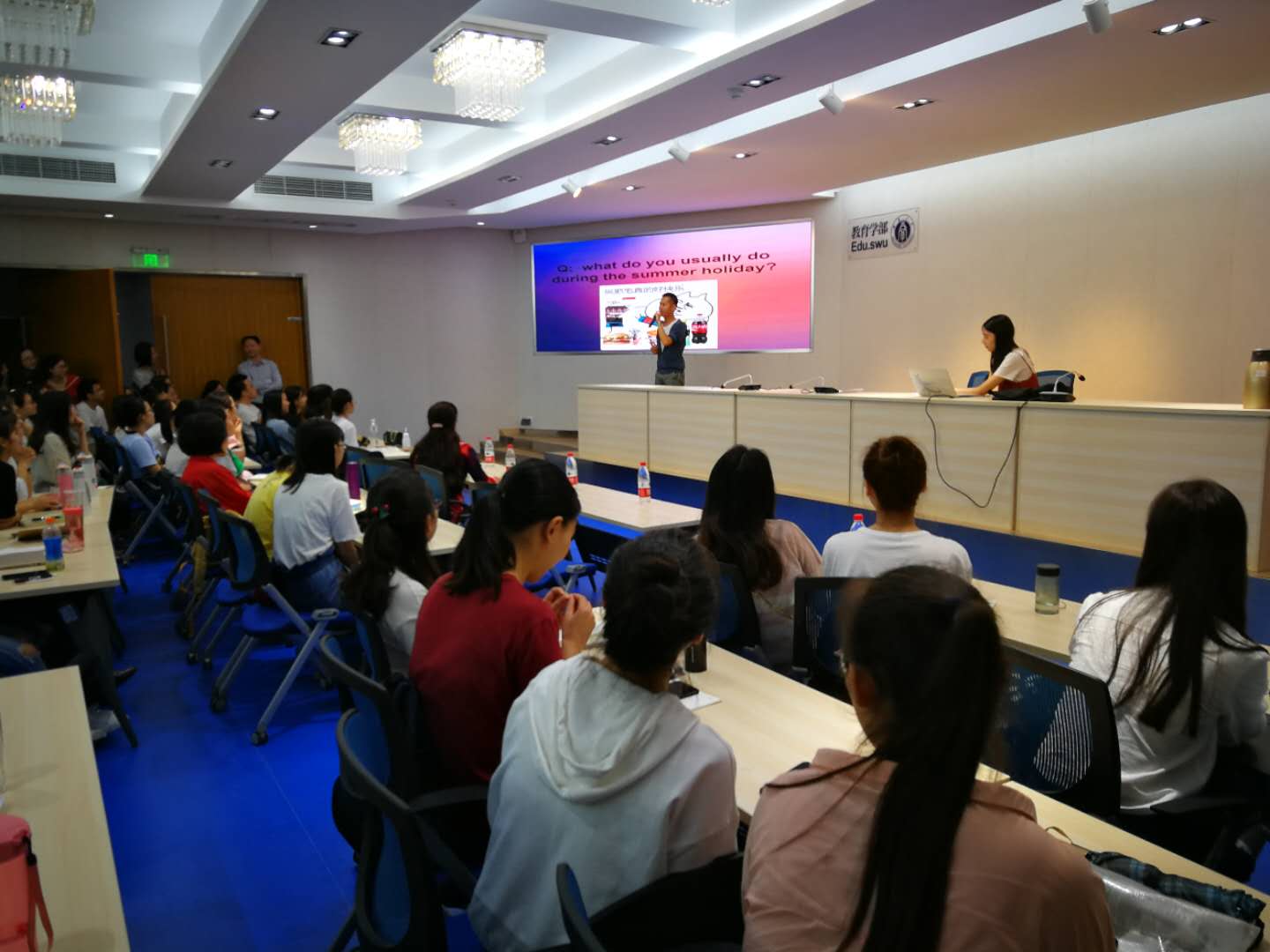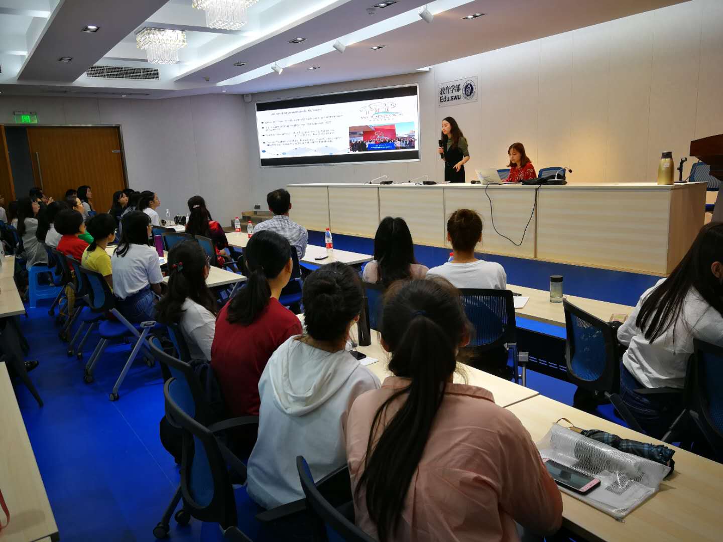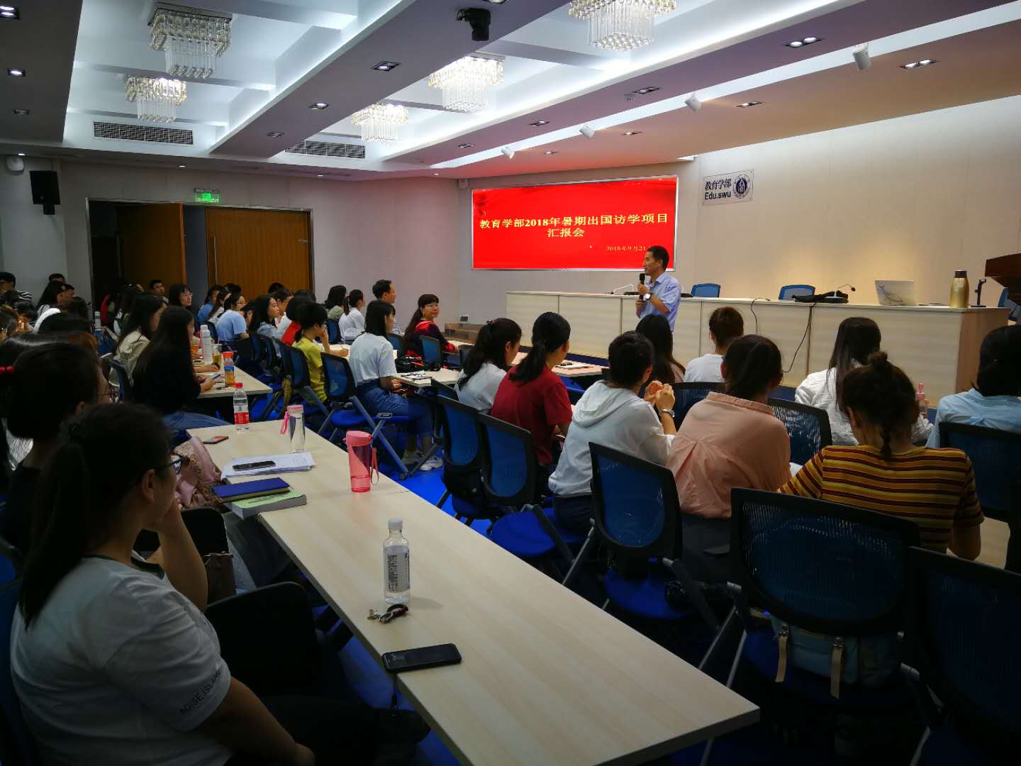 出席本次汇报会的有:学部副部长王牧华教授、国际合作交流中心戴华鹏主任、全英文教研室王雪主任及留学生班主任周玲老师。还包括暑期三个海外访学项目的全体成员和学部2018级研究生同学们。汇报会由戴主任主持。