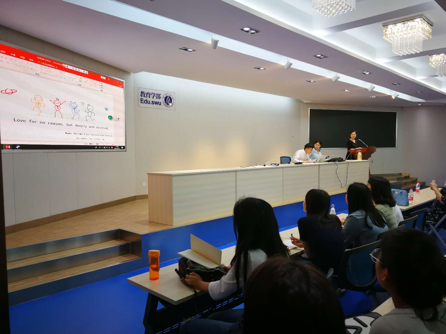 接下来便是同学们的汇报。新西兰教师实习项目的同学代表首先介绍了新西兰怀卡托大学及其教育学部的基本情况。其次介绍了新西兰的课程大纲,以及新西兰的包容性的教育。同学们还就此次访学的具体情况,分别从课堂体验、寄宿家庭体验以及社会文化活动等方面来介绍了访学的收获。