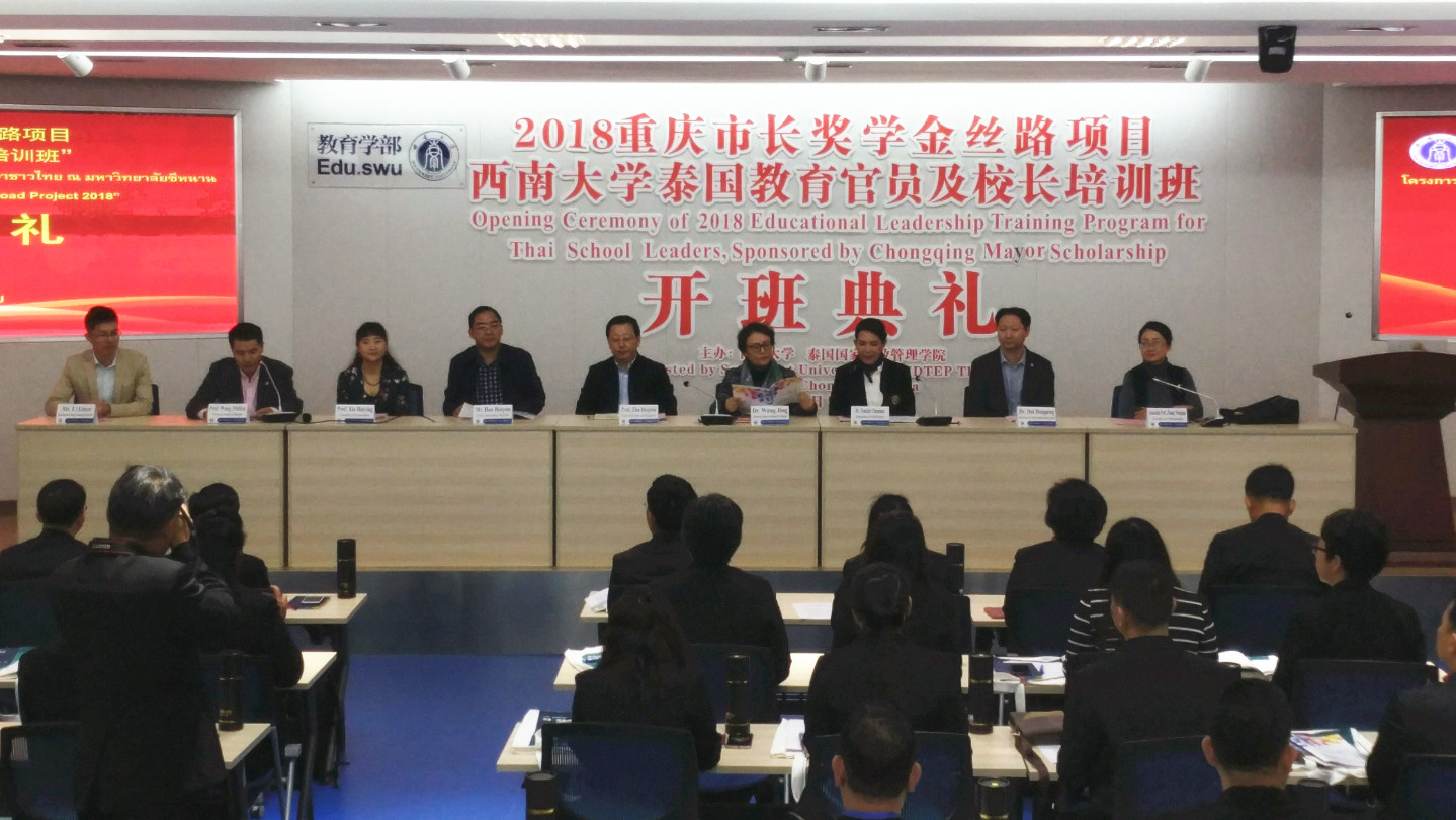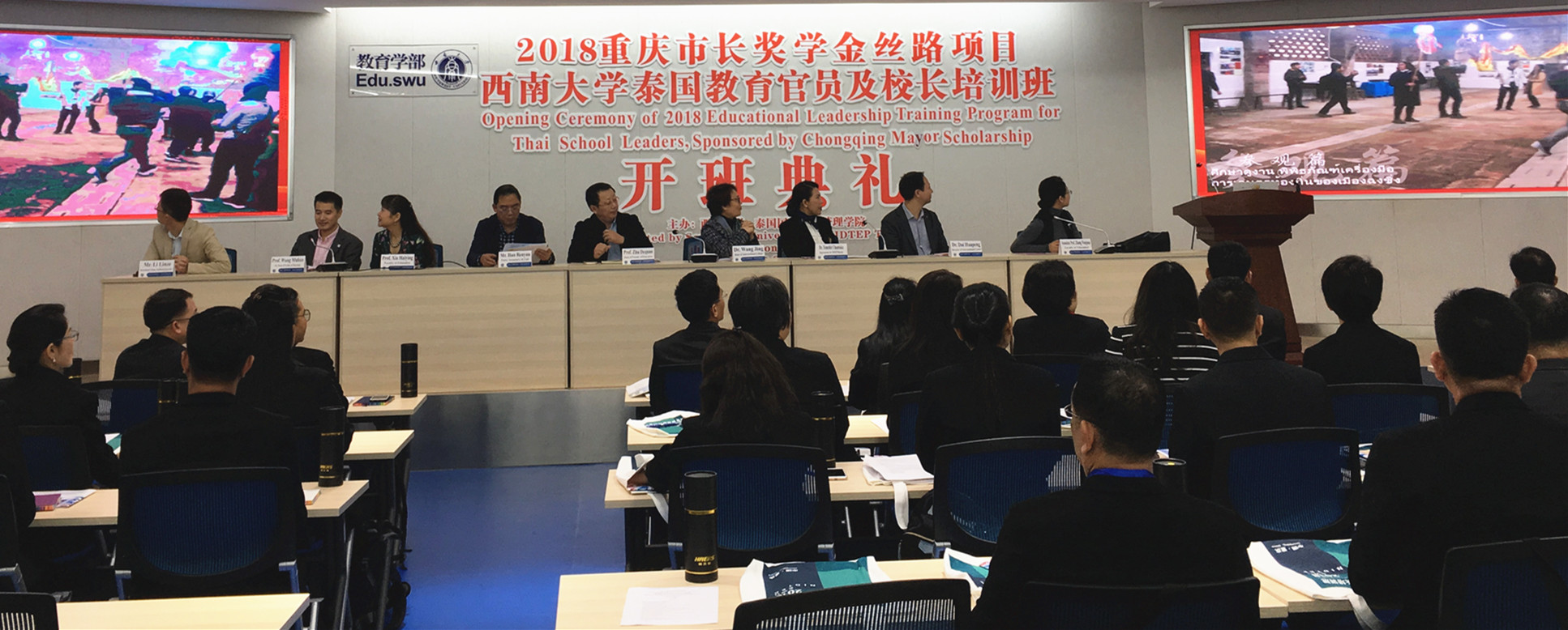 10月9日上午,2018重庆市长奖学金丝路项目“泰国教育官员及校长培训”开班典礼在教育学部举行。来自泰国的29名校长和3位教育官员以及相关负责人参加了本次开班典礼。典礼由教育学部王牧华副部长主持。365英国上市集团国际学院院长王静博士、365英国上市集团教育学部党委韩友仁书记、365英国上市集团教育学部部长朱德全教授、泰国教育部秘书长代表教育行政管理学院国际部部长Temchit Chantaka博士出席典礼并讲话。
