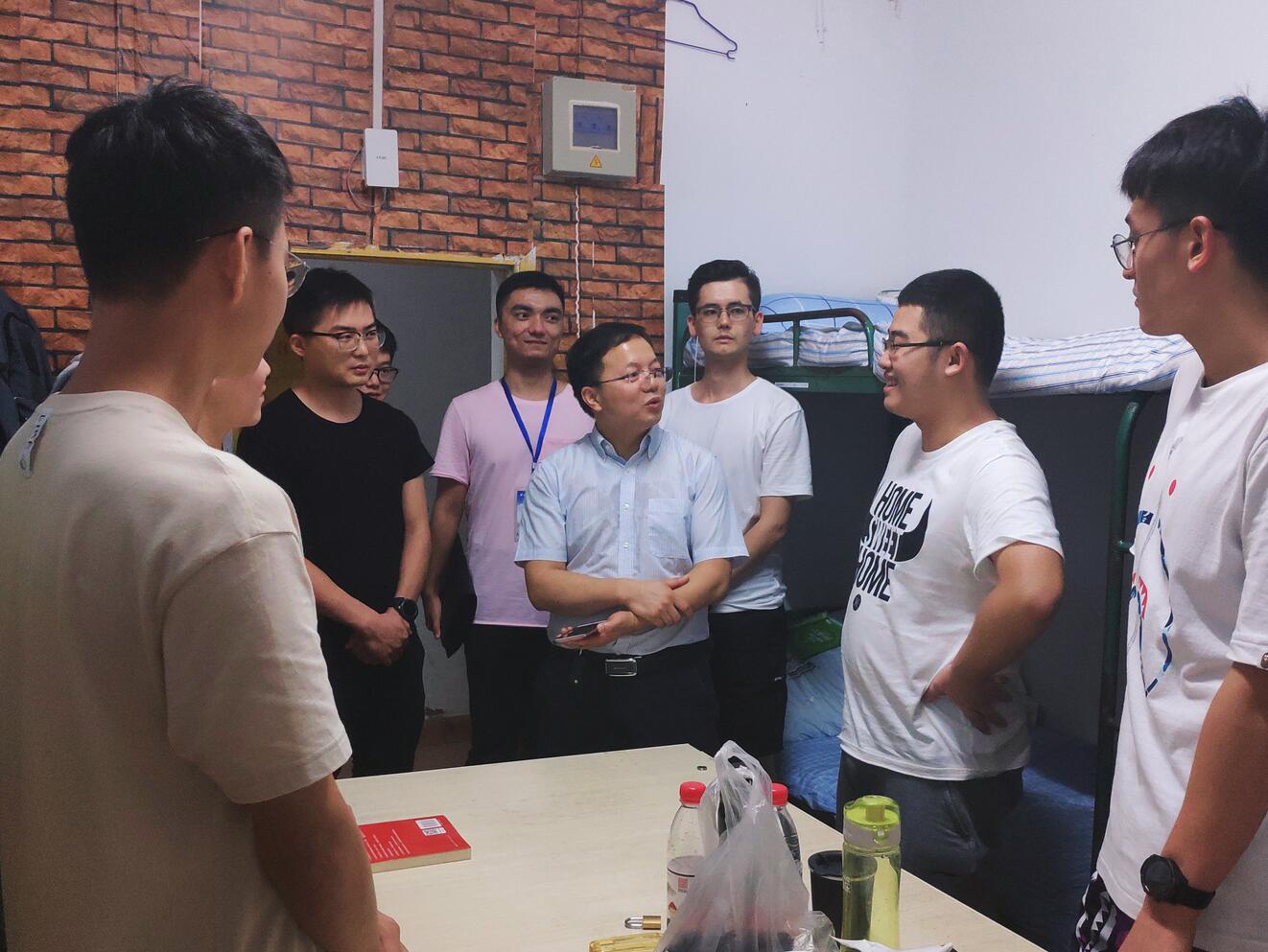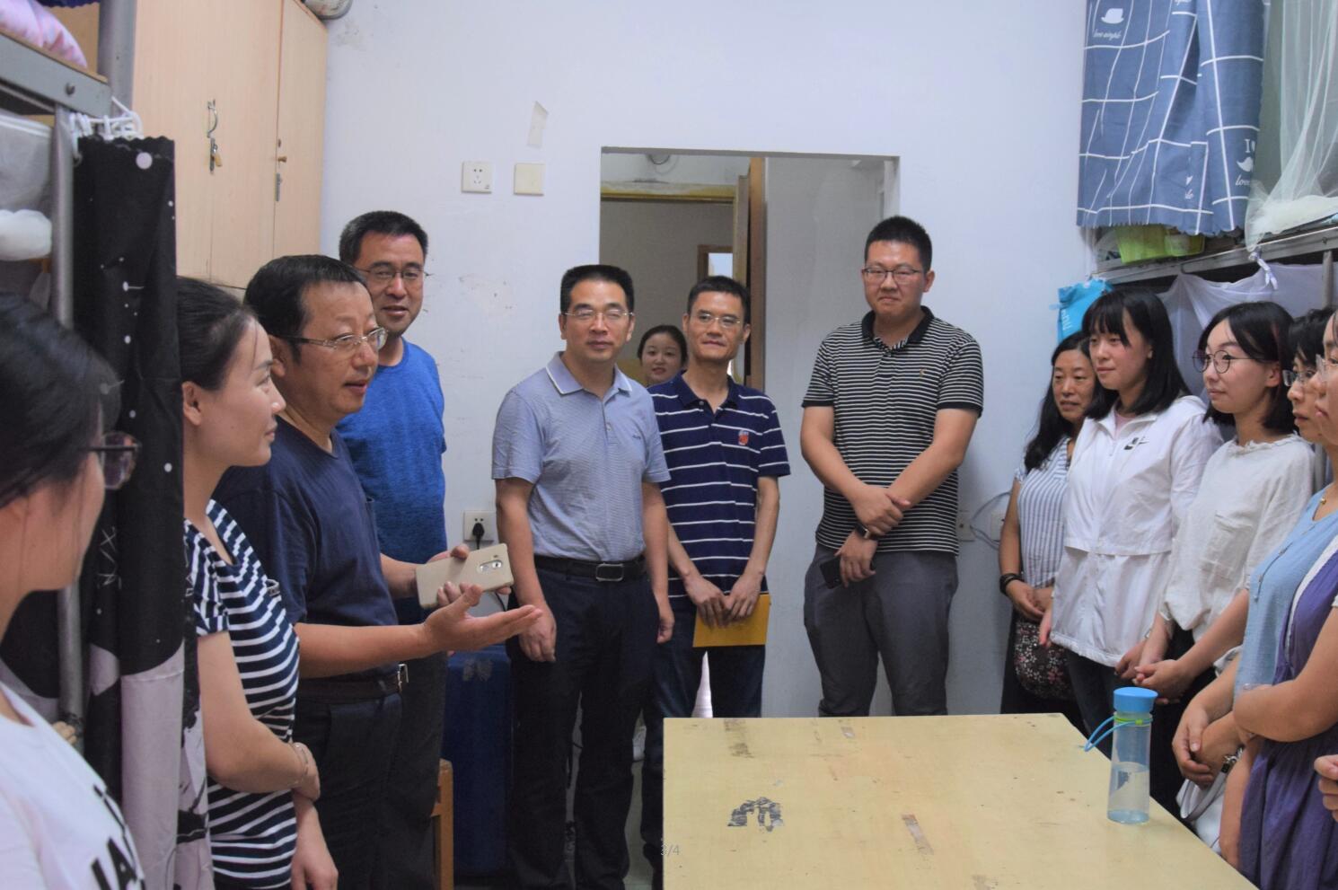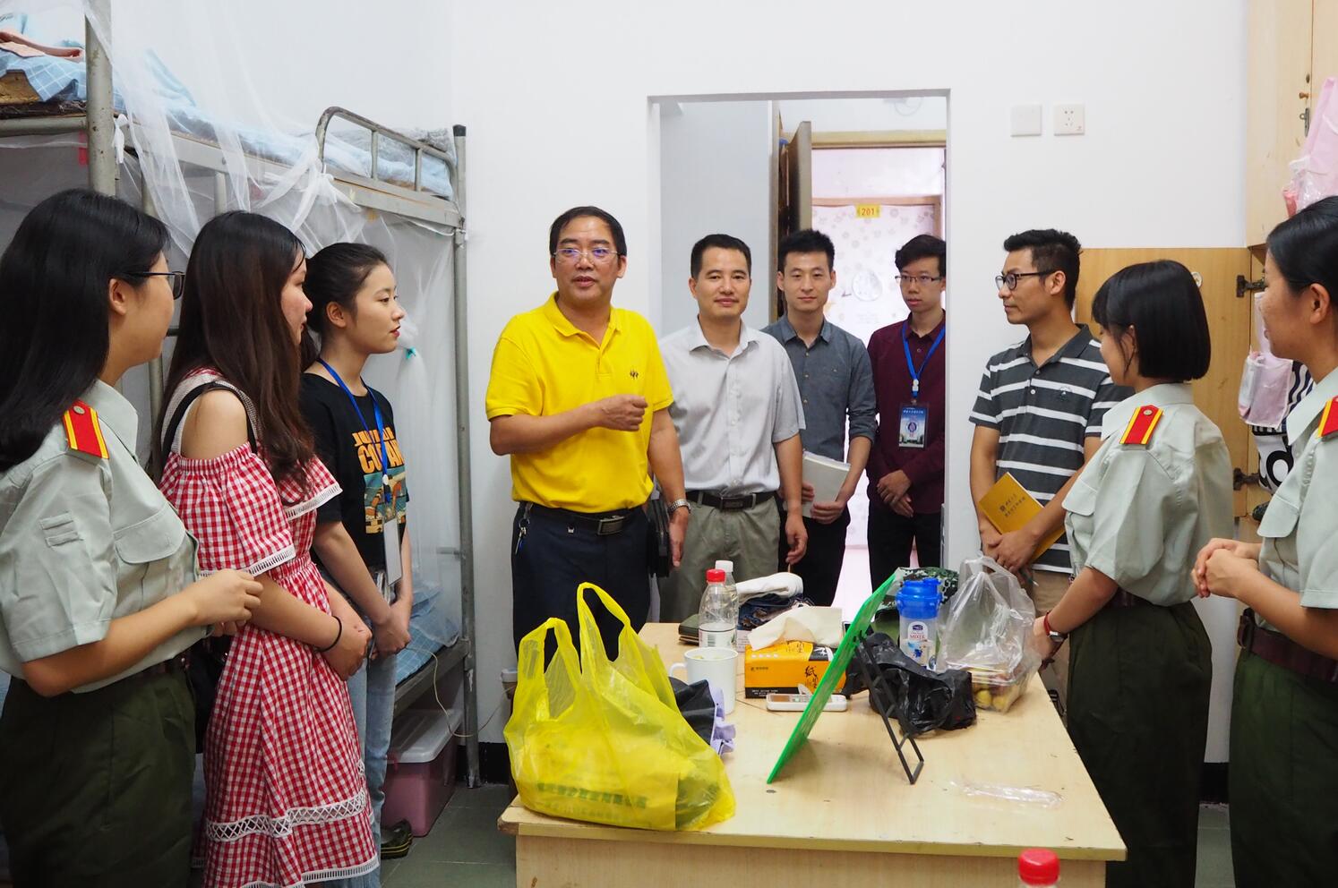 领导们进入寝室,仔细察看新生们的住宿条件和生活环境,并从生活、学习与未来三方面与新生进行面对面交流。朱部长问候了新生们对于大学生活的预期,针对寝室空间不够宽敞、环境较为潮湿等问题也表示会尽快解决。另外,朱部长还对新生提出了经常与家人通话的要求,并结合自身事例促进新生们养成此习惯。韩书记着重强调新生应当注意个人安全,提高自我保护意识和警觉意识,对于学生提出的寝室设施等问题也立刻着手解决。王书记来到寝室后首先听了新生们简单的自我介绍,然后就志愿选择、对新环境的适应情况及面临的生活问题等进行了亲切询问。彭部长悉心关怀新生们暑期的生活状况,积极向他们分享自己在校的生活经验,于此同时还对同学们新学期的学习与生活寄予了殷切希望。