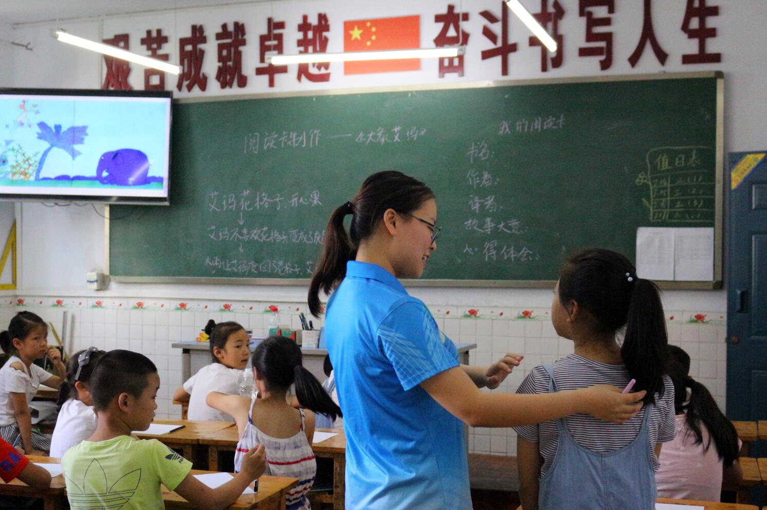 “花儿笑,树儿摇,小鸟唱歌小兔跳……”微风徐徐,书声朗朗,沐浴在晨曦之中,字里行间的美感尤为惊艳。亲切简洁的童谣激发了孩子们朗读的兴趣,他们争相走上讲台,与老师一起吟诵,携手享受语言之美。充盈在课堂里的爱就像普照的阳光,温暖了每一个孩子,也温暖了服务队的每一位成员。