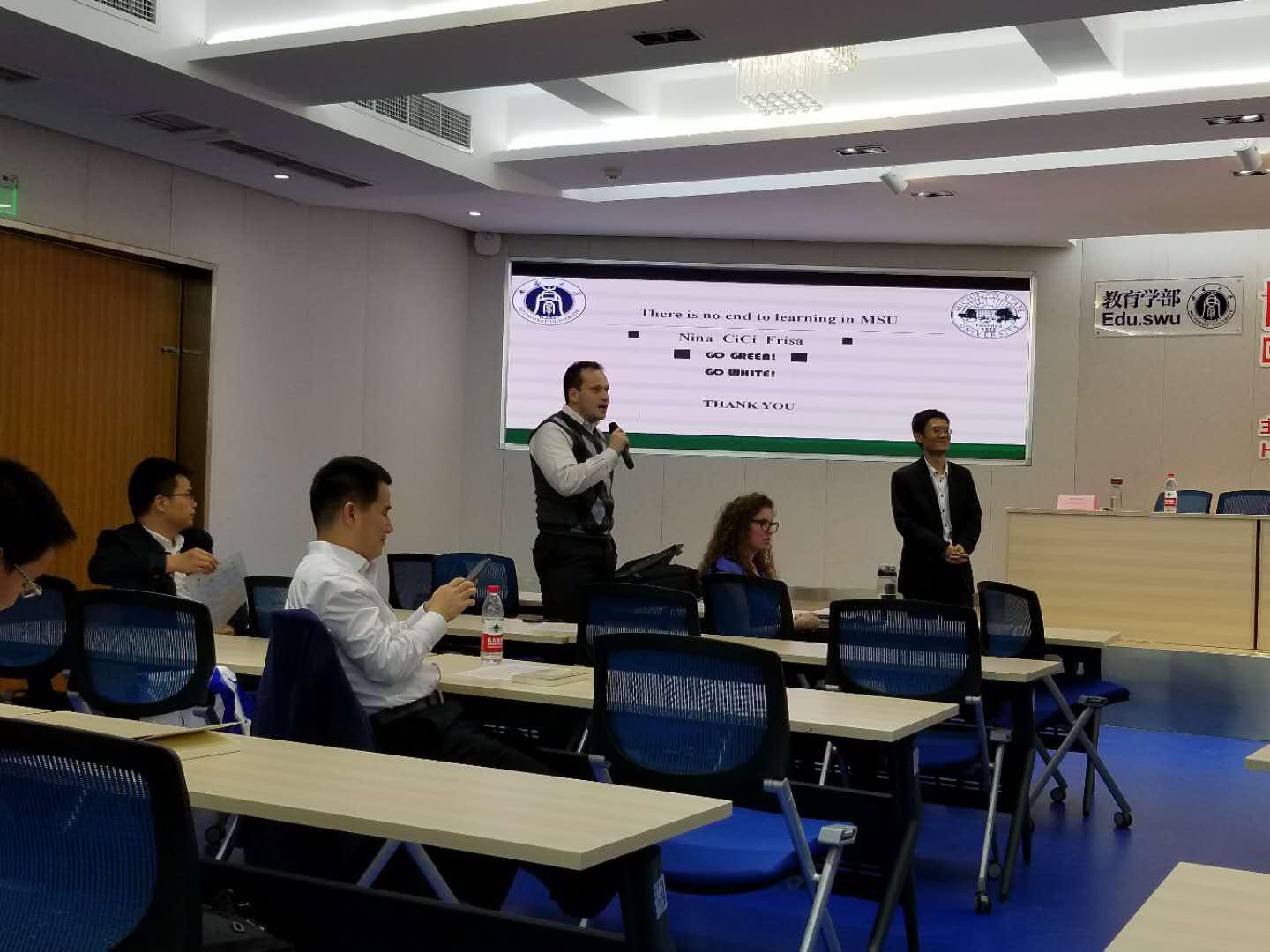 大会主题发言人分别是来自MSU的运动心理学专业的博士三年级学生Kathleen Mellano、教育学部比较教育专业全英文硕士三年级留学生Kayleigh Sturrup、以及学部赴MSU访学归来的赵彩霖、杨静秋和吴悠同学。