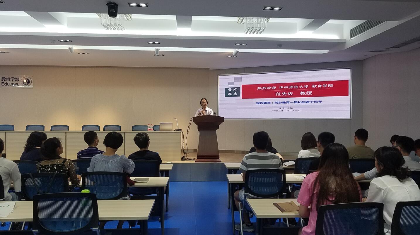 5月21日(星期一)晚,华中师范大学教授、博士生导师范先佐教授在教育学部811报告厅以“城乡教育一体化的若干思考”为主题进行了专题讲座。讲座由西南民族教育与心理研究中心主任、教育学部张学敏教授主持,教育学部及西南民族教育与心理研究中心的师生们参加了此次讲座。