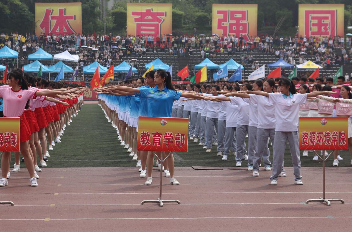 闭幕式伊始,教职工队伍进行广播操比赛,整齐划一的动作,斗志昂扬的气势,为我们树立了青春的榜样。紧接着,学生组的广播操比赛将闭幕式的氛围推向高潮,三十多个学院队伍一字排开,各学院(部)的旗帜在阳光下闪闪发光,作为运动会的压轴比赛项目,广播操比赛更像是一场盛大的表演。意气风发的教育学部姑娘们完美展现出教育学部的风采,接近一个月的坚持成就其干净利落的动作,一静一动,一帧一画,尽显美感与力量。短短的赛程背后是无数个与星辰相伴的夜晚,辛苦了教育学部的姑娘们,为你们的坚持点赞,为你们的表演欢呼。比赛结束后,各学院(部)广播操团队齐跳现代健美操,活力四射,舞动青春。