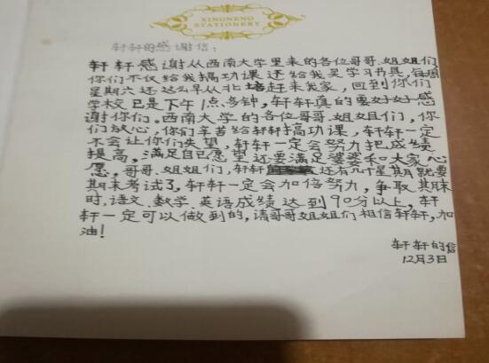 爱在传递,爱的种子在发芽并长大。帮扶对象在志愿者们爱的关怀下,也在表达着真诚的感恩,为志愿者们写下一封封感谢信。