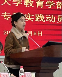 2022级优秀实习生代表小教专硕李一玉分享了她的实习收获并给学弟学妹们提出三点建议,一是要在寒假中做好实习以及角色转变的准备;二是要与他人携手同行,互帮互助,共同进步;三是要学会反思,及时总结教学的得与失。