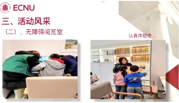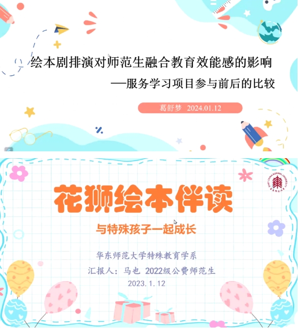 接下来,沈阳师范大学心翼手语社团葛舒梦同学汇报分享《绘本剧排演对师范生融合教育效能感的影响——服务学习项目参与前后的比较》研究。华东师范大学曙光志愿者服务队马也同学介绍了在上海特殊教育学校开展的“花狮绘本伴读”项目。范程同学介绍了特殊教育学系与上海市少年儿童图书馆合作开展的无障碍阅读服务。