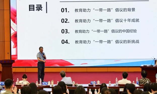 徐辉教授以“新时代教育助力‘一带一路’倡议建设的十年成就、历史经验与时代挑战”为题作特邀报告,从语言互通、人才建设、学生交流规模、教育援助等方面展现了十年成就,总结了秉持“人类命运共同体”的发展理念、推动文化交流互鉴、坚持理性思维、降低信息不对称、做大集体利益、积累声誉等中国经验。