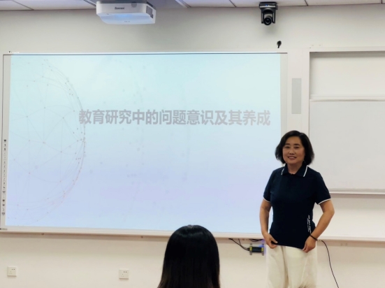 讲座中,闫广芬教授围绕为何强调问题意识、何谓问题意识、如何养成问题意识三个方面进行了分享。她提出选题是研究的起点,为研究确立了目标,同时也是衡量研究者创造才能的重要依据。随后,闫教授从心理、精神、能力三个层面综合论述了问题意识的内涵,并指出一个好的问题首先是尚未得到解释和解决、值得怀疑的问题,其次应具有学术底色和当代视野,并鼓励同学们选择中国本土的教育问题进行探索。而要做到这一点,必须打好良好的学识基础且随时掌握学科领域中的最新研究动态,并保持一种怀疑、探究的心理状态,在沟通理论与实践、宏观与微观中发现问题。