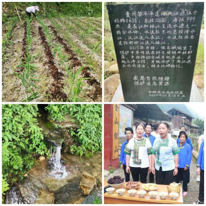 为考察黔东南保留完整的农耕文化,调研小组还分别走访了当地的两大民居部落。在归根部落,调研小组到达了两江源刻碑处和饮用水水源一级保护区“红豆杉山泉水”发源地,见证了当地为保护生态水资源所做的努力,同时也对部落特色生姜和稻米的生态种植与红色旅游景点“马踢井”(也叫“红军井”)进行了实地勘察。调研期间,实践团成员还受到当地的热情款待,体验了贵州特色的“拦门酒”和“长桌宴”。当地村书记石修彩介绍了本土特色农产品——生态小黄姜姜糖片、特色生态虫茶、胭脂紫米粉和胭脂紫米米皮粉,分享了归根部落做好绿色有机农产品的生态可持续智慧:创新性形成了“三净”理念,即“净塑、净土、净心”。