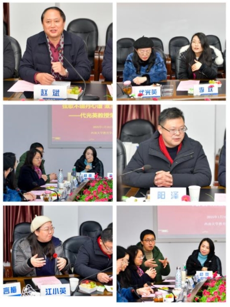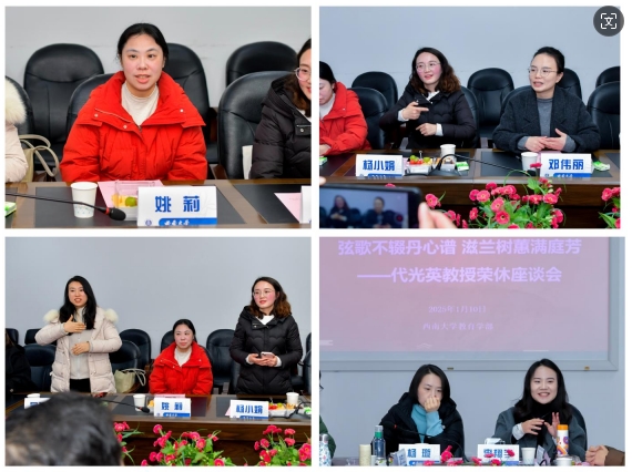 座谈会伊始,主持人赵斌教授以深情话语拉开序幕,学部领导王正青教授高度赞扬代光英老师40年如一日的辛勤耕耘,称她为西大特教的“第一人”“专业坚守人”“特教传道人”与“后辈暖心人”,肯定其为特教专业发展和学生成长做出的卓越贡献。