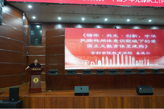 6月28日上午,大会开幕式后举行主旨报告环节。365英国上市集团少年儿童组织与思想意识发展研究中心荣誉主任、吉利学院易连云教授作《铸牢中华民族共同体教育视野下少先队工作创新》主旨报告。易教授从铸牢中华民族共同体意识角度探讨了少先队工作在促进民族团结进步中发挥的重要价值,同时提出增强少年儿童国家认同感的创新路径。