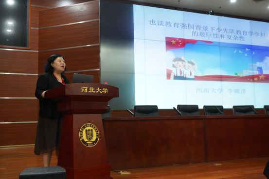 紧接着,中心主任李姗泽教授在大会作《也谈教育强国背景下少先队教育学学科建设的艰巨性与复杂性》主旨报告。李教授深入剖析了在建设教育强国的宏伟目标下,少先队教育学作为一门新兴交叉学科所面临的理论体系构建、专业人才培养、实践转化应用等多重挑战与复杂面向,强调了学科建设的基础性与紧迫性。