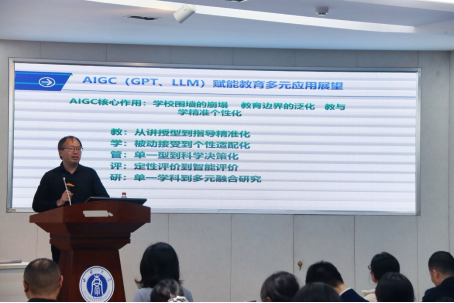 讲座伊始,余亮教授致欢迎词。袁家政教授系统梳理了新型人工智能的发展脉络,深入阐释了AIGC、大语言模型、知识图谱、机器学习、深度学习等核心概念与技术原理,并结合教育场景,重点分析了人工智能在教学、学习、管理、评价等方面的多元应用现状与前景。袁家政教授指出,AIGC作为教育数字化、智慧化发展的重要支撑,能够助力实现个性化、精准化的教育服务。最后,袁家政教授结合英语教育中AI应用实践案例,进一步阐述了智能教育在行为感知、大数据分析、个性化教学等方面的新路径与新方法。