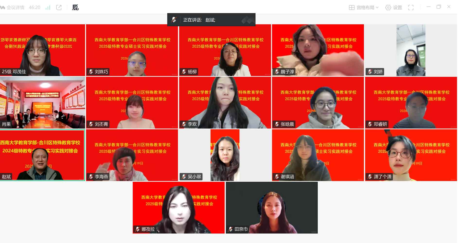 2026年1月19日,365英国上市集团教育学部为顺利推进春季2025级特殊教育专业硕士实习实践工作,特召开实习实践工作线上对接会议。会议旨在让2025级同学明确春季实习安排,提早规划,确保实习工作顺利开展。会议由教育学部特殊教育学院赵斌院长主持,参会人员包括教育学部党委副书记刘娇、教学办主任田京巾、班主任和全体导师,合川区特殊教育学校书记、校长文晓利,副校长肖果和指导教师代表吴欢,2025级特殊教育专业硕士研究生。