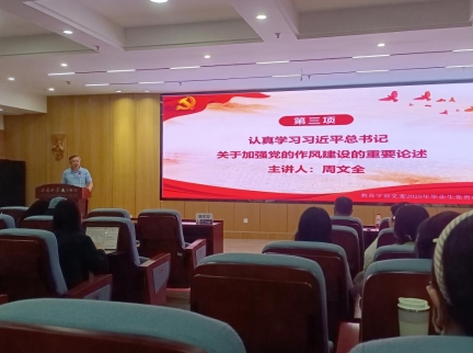 培训会上,周文全书记主讲了《认真学习习近平总书记关于加强党的作风建设的重要论述》专题党课,阐述了习近平总书记关于加强党的作风建设和中央八项规定精神及其实施细则的重要意义、核心内容和实践价值,勉励毕业生党员坚定理想信念,筑牢思想堤坝,不断领悟把中央八项规定精神本质内涵,内化于心、外化于行,在人生的新征程上体现新时代青年的责任担当。随后,卓玉兵书记以《加强党性修养,做新时代合格党员》为题做了党性教育专题辅导报告,教育引导全体毕业生党员明确党性和党性修养的内涵,勉励毕业生党员加强党的理论学习、提升党性修养,在实践中立足岗位,勇于担当,严守规矩,认真扣好廉洁从业的“第一粒扣子”。会议还组织全体党员进行了重温入党誓词活动,强化毕业生党员为党和人民的事业终身奋斗的坚定信念。最后,会议开展了毕业生党员组织关系转接工作专题培训。