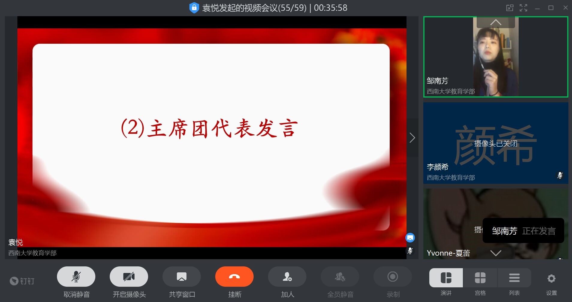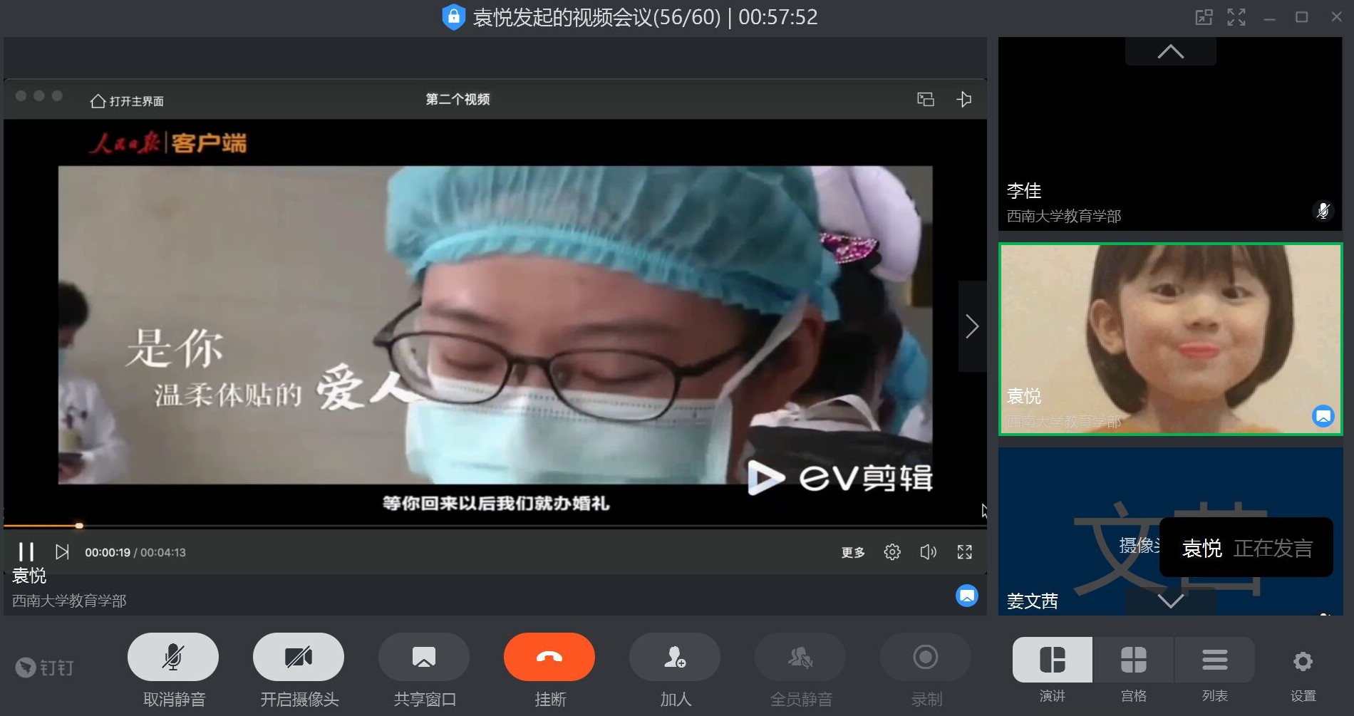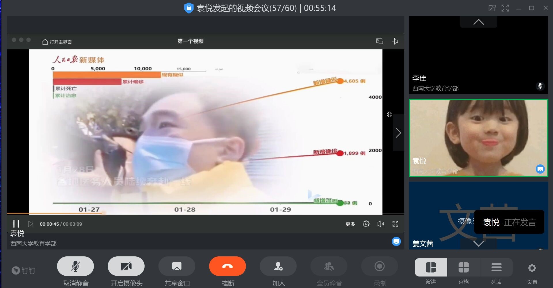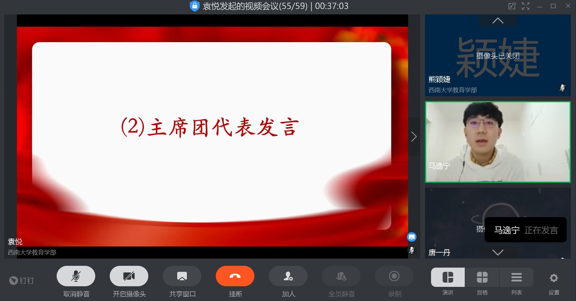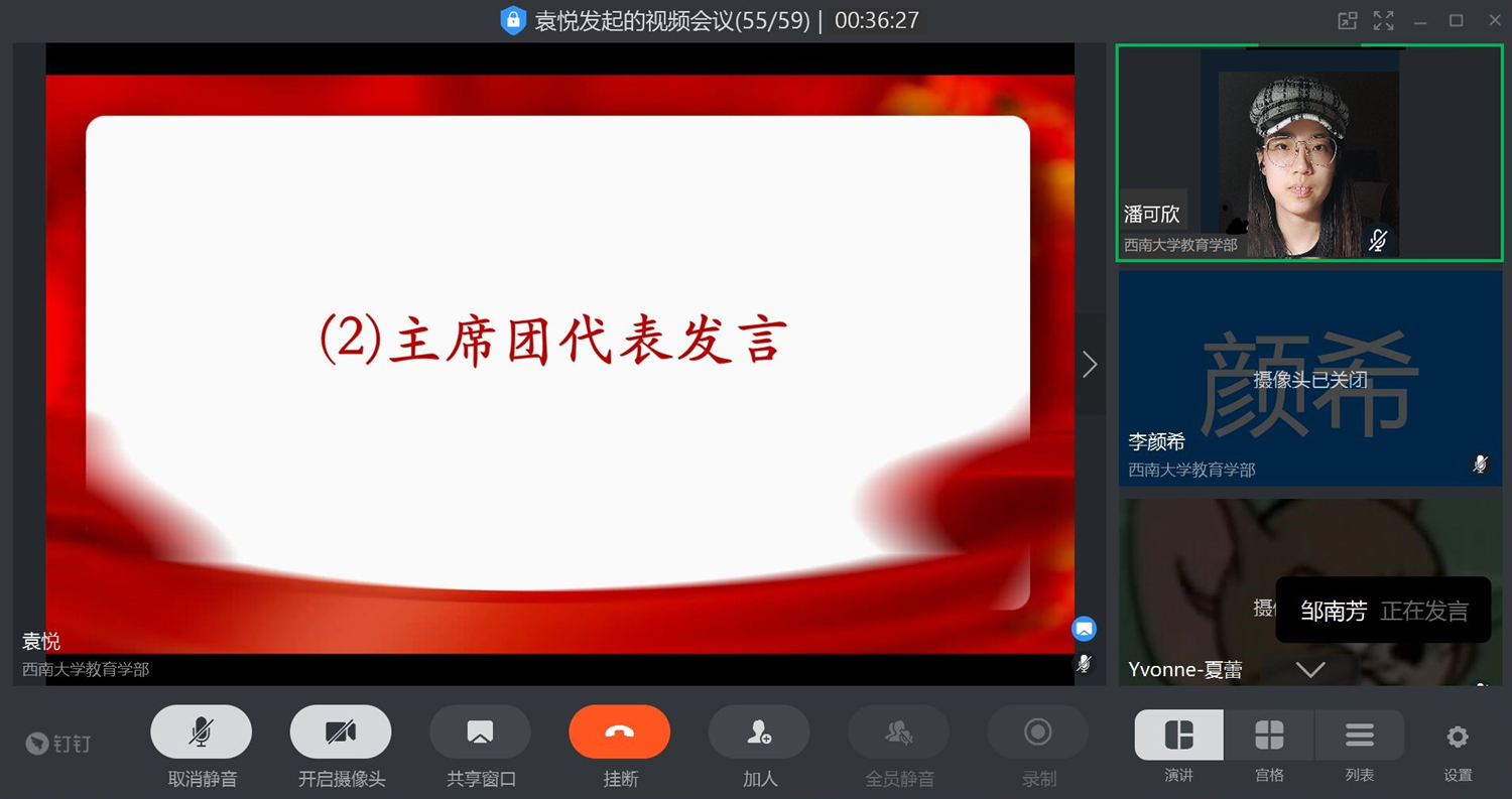 本次会议在钉钉平台开展,开启了一场爱国主义主题教育的“云会议”。教育学部研究生辅导员、研究生团总支研究生会指导老师李佳出席了本次会议,会议由副主席马逸宁和组织部袁悦共同主持。