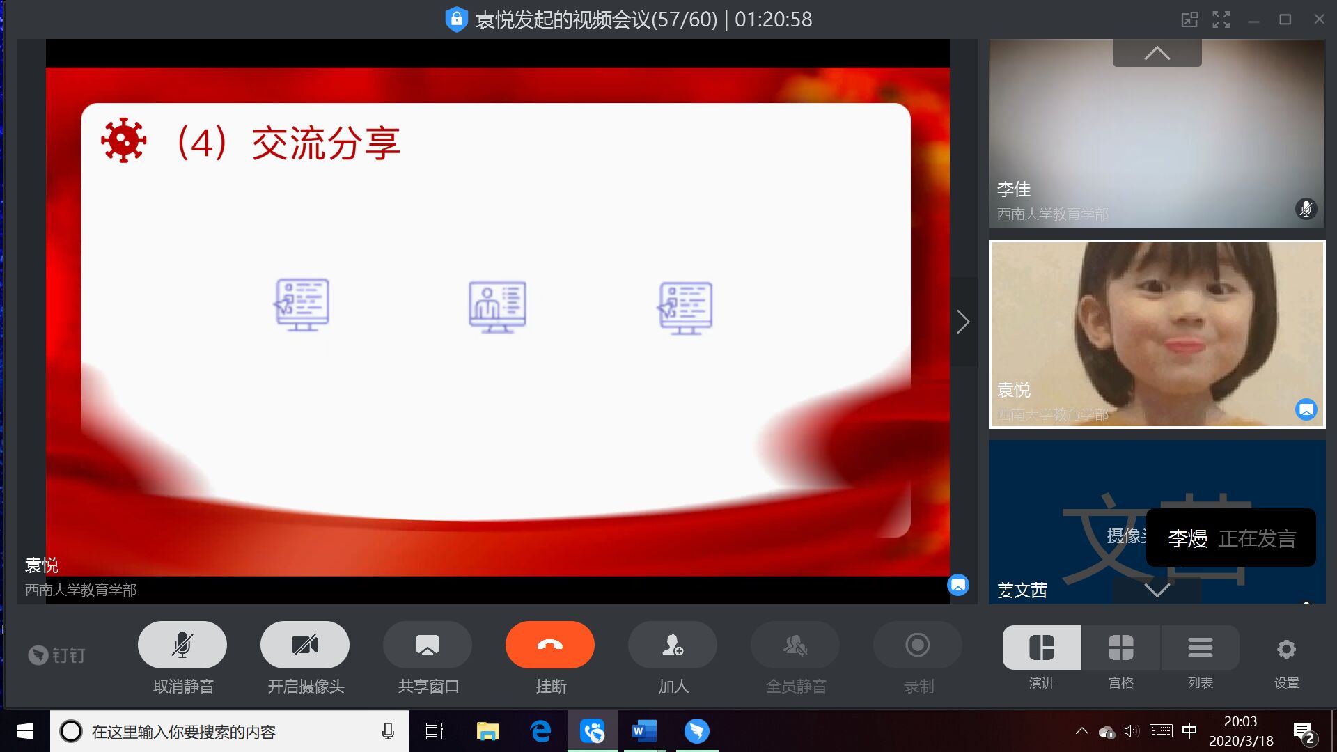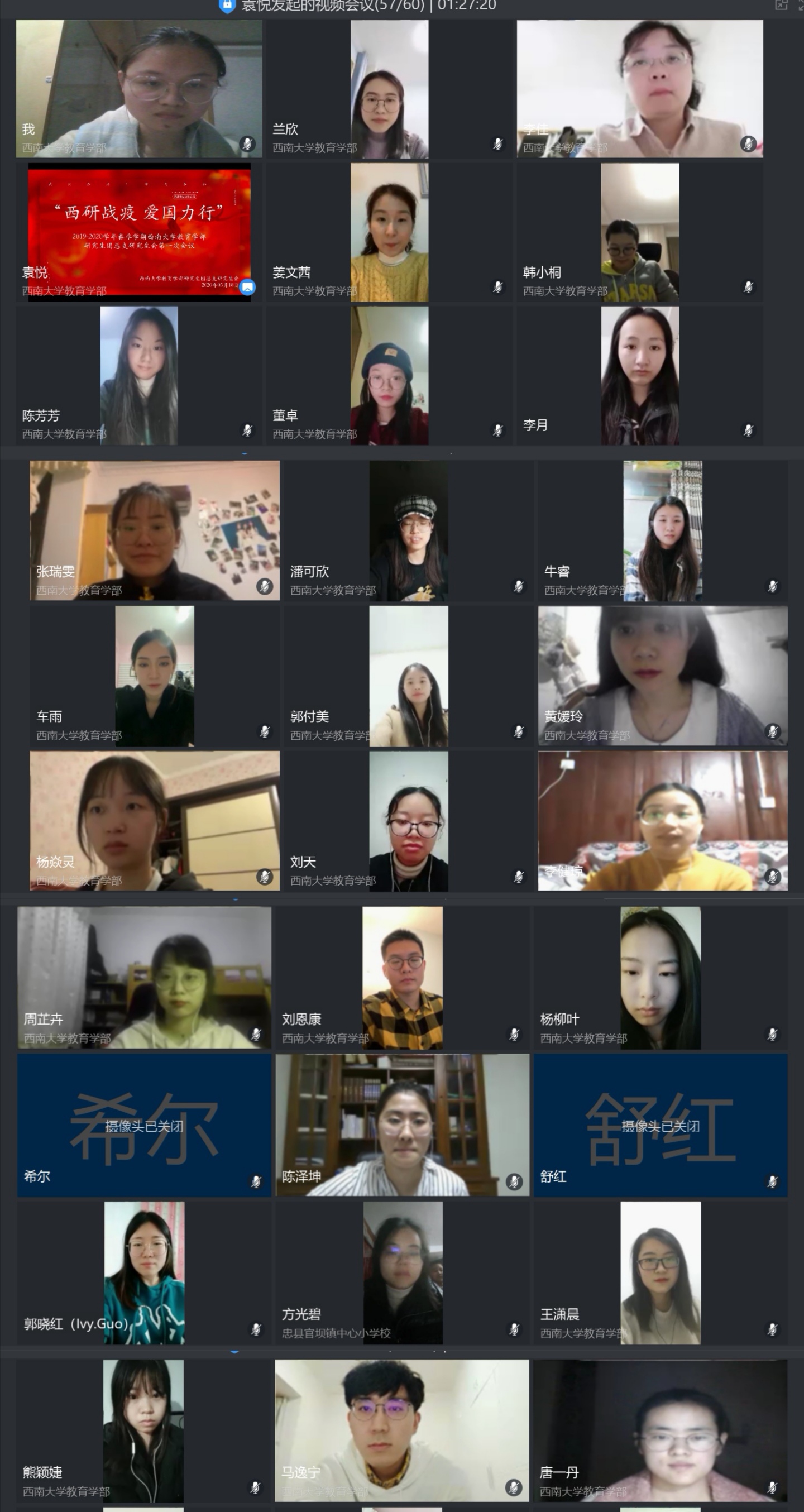 为落实学校疫情防控指挥部的决策部署,弘扬爱国主义精神,培养爱国主义情怀,切实推进爱国主义教育,培养研究生干部在当前时代背景下的责任与担当,宣传和学习在抗击疫情过程中的优秀典型,2020年3月18日19时,教育学部研究生团总支研究生会特举办“西研战疫,爱国力行”学习活动暨2019-2020学年春季学期第一次线上全体大会。