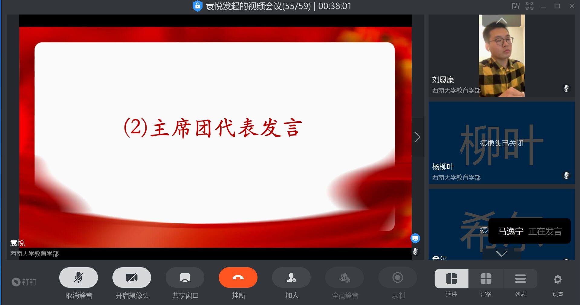 继主席团发言之后,组织部、宣传部、社会实践部、少数民族事务部、秘书处、学习部、文体部和艺术团研会八个部门负责人就疫情期间新学期工作计划分别进行了详细阐述。