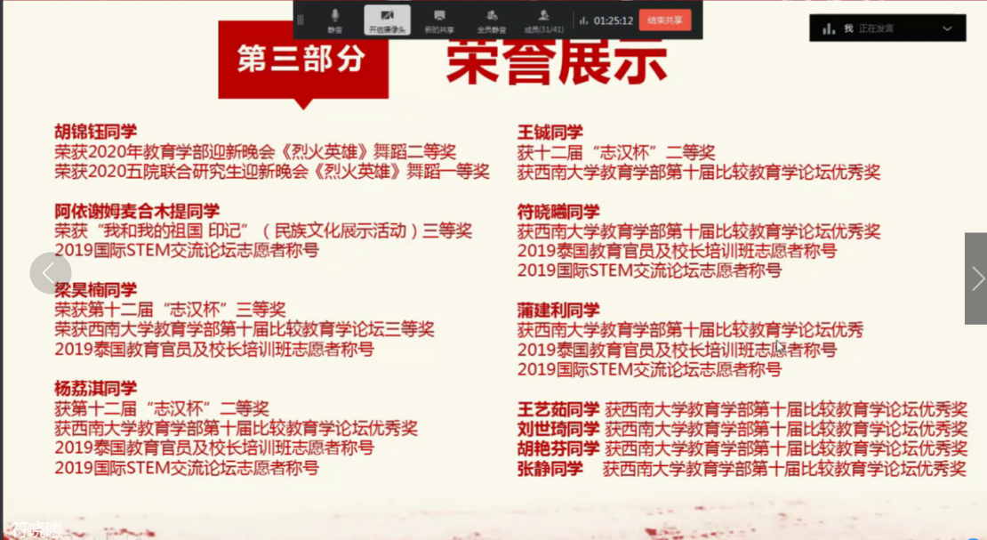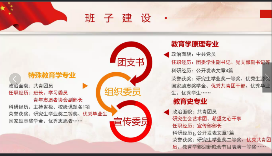 为弘扬“五四”精神,提升学部各研究生团支部的凝聚力和创造力,进一步加强基层团组织的制度建设,4月19日晚,教育学部研究生团总支组织部通过钉钉在线组织了“为团共添光辉,共创优秀支部”五四红旗团支部评选大会。