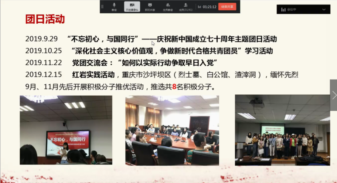 在活动最后,主持人对本次评选活动进行了总结。主持人感谢各位发言人的精彩讲演和积极配合,并赞扬了各团支部在近一年来积极开展工作的热情和付出。最后,在主持人的组织下,与会人员进行了线上合影。