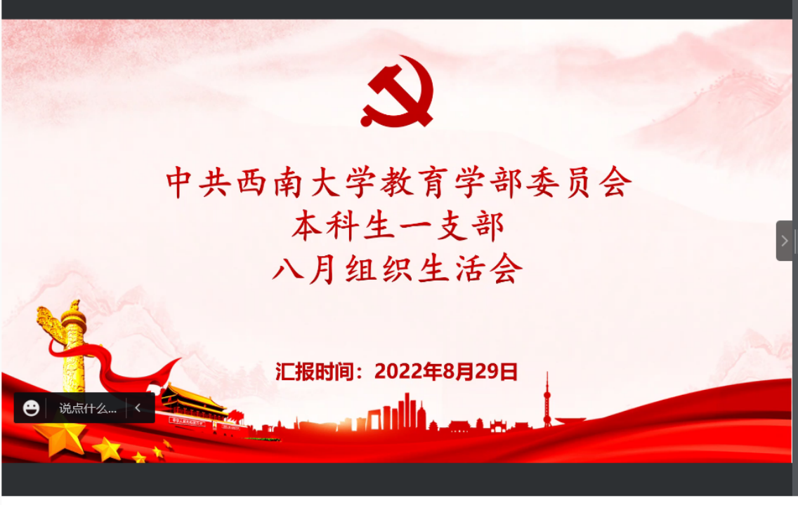 2022年8月29日,教育学部本科生第一党支部在腾讯会议平台开展了八月线上主题党日活动。活动由教育学部党委副书记、本科生一支部书记刘娇主持。