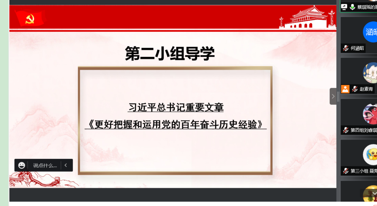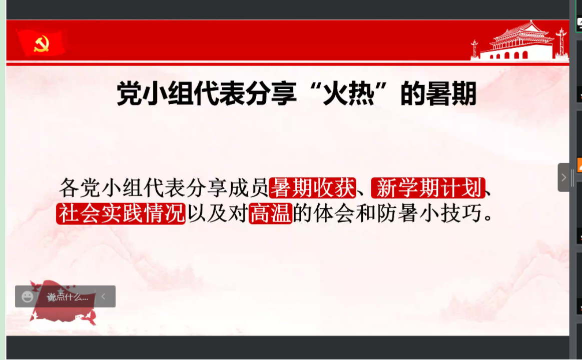 在集中学习《更好把握和运用党的百年奋斗历史经验》精神后,各党小组代表分享本组同志的暑期学习收获、暑期社会实践情况,新学期计划以及高温防暑技巧和体会。